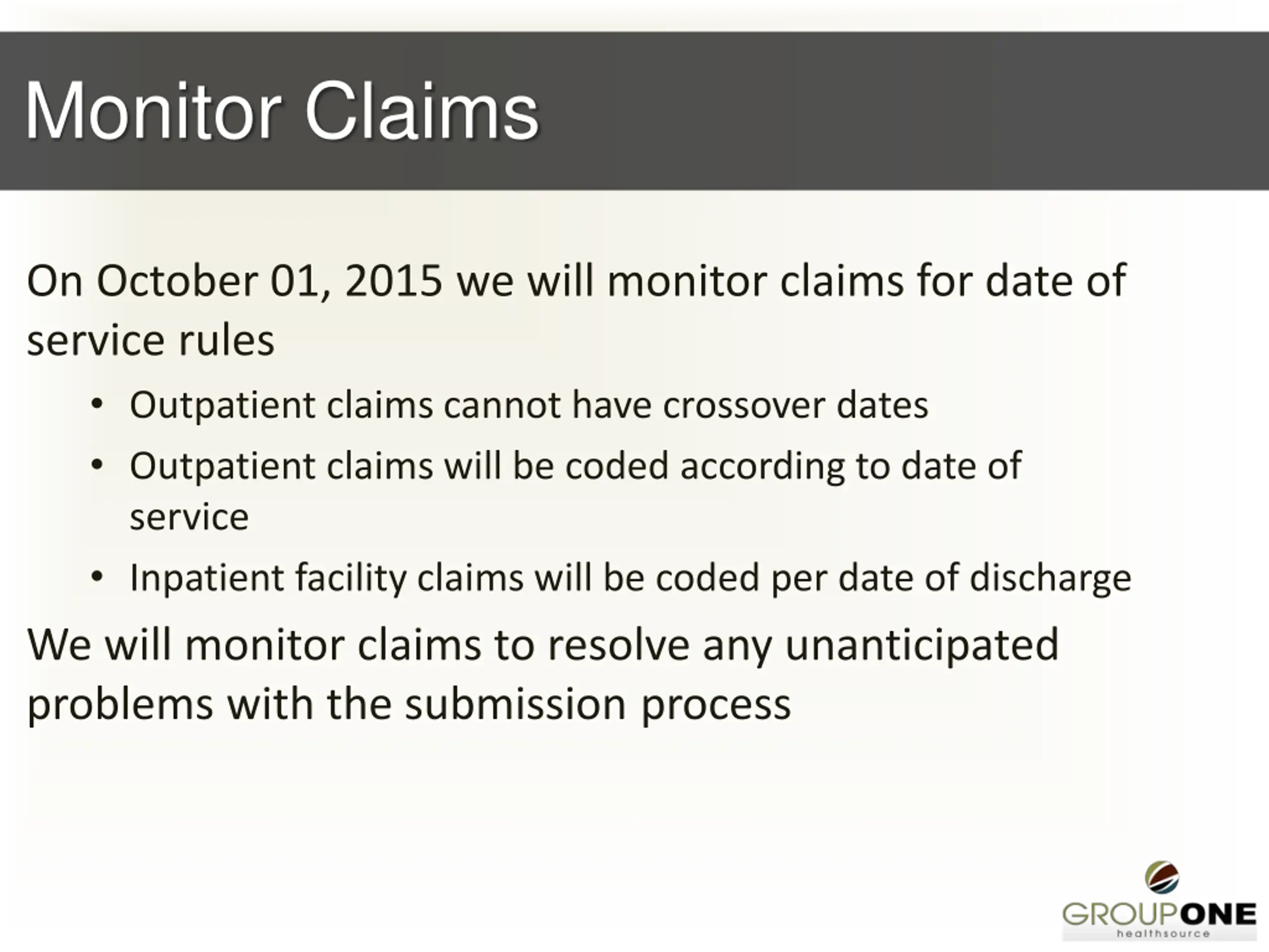 Monitor Claims On October 01, 2015 we will monitor claims for date of service rules Outpatient claims cannot have crossover dates Outpatient claims will be coded according to date of service Inpatient facility claims will be coded per date of discharge We will monitor claims to resolve any unanticipated problems with the submission process