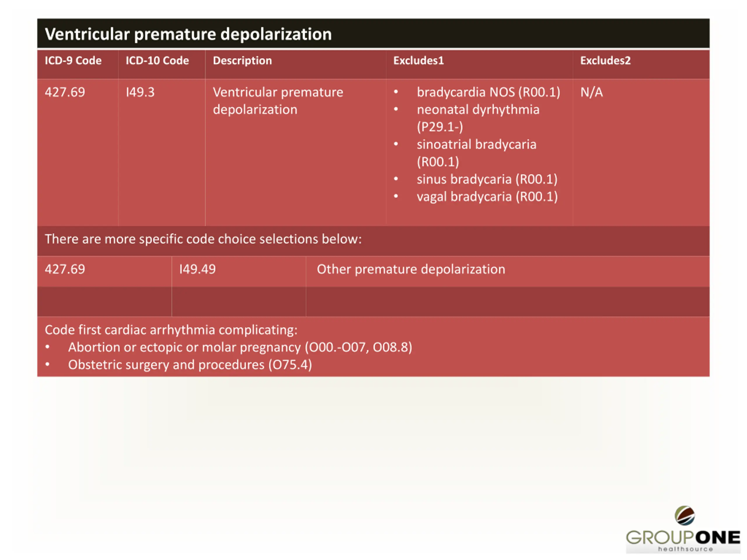 Ventricular premature depolarization ICD-9 Code ICD-10 Code Description Excludes1 Excludes2 427.69 I49.3 Ventricular premature depolarization bradycardia NOS (R00.1) neonatal dyrhythmia (P29.1-) sinoatrial bradycaria (R00.1) sinus bradycaria (R00.1) vagal bradycaria (R00.1) N/A There are more specific code choice selections below: 427.69 I49.49 Other premature depolarization Code first cardiac arrhythmia complicating: Abortion or ectopic or molar pregnancy (O00.-O07, O08.8) Obstetric surgery and procedures (O75.4)