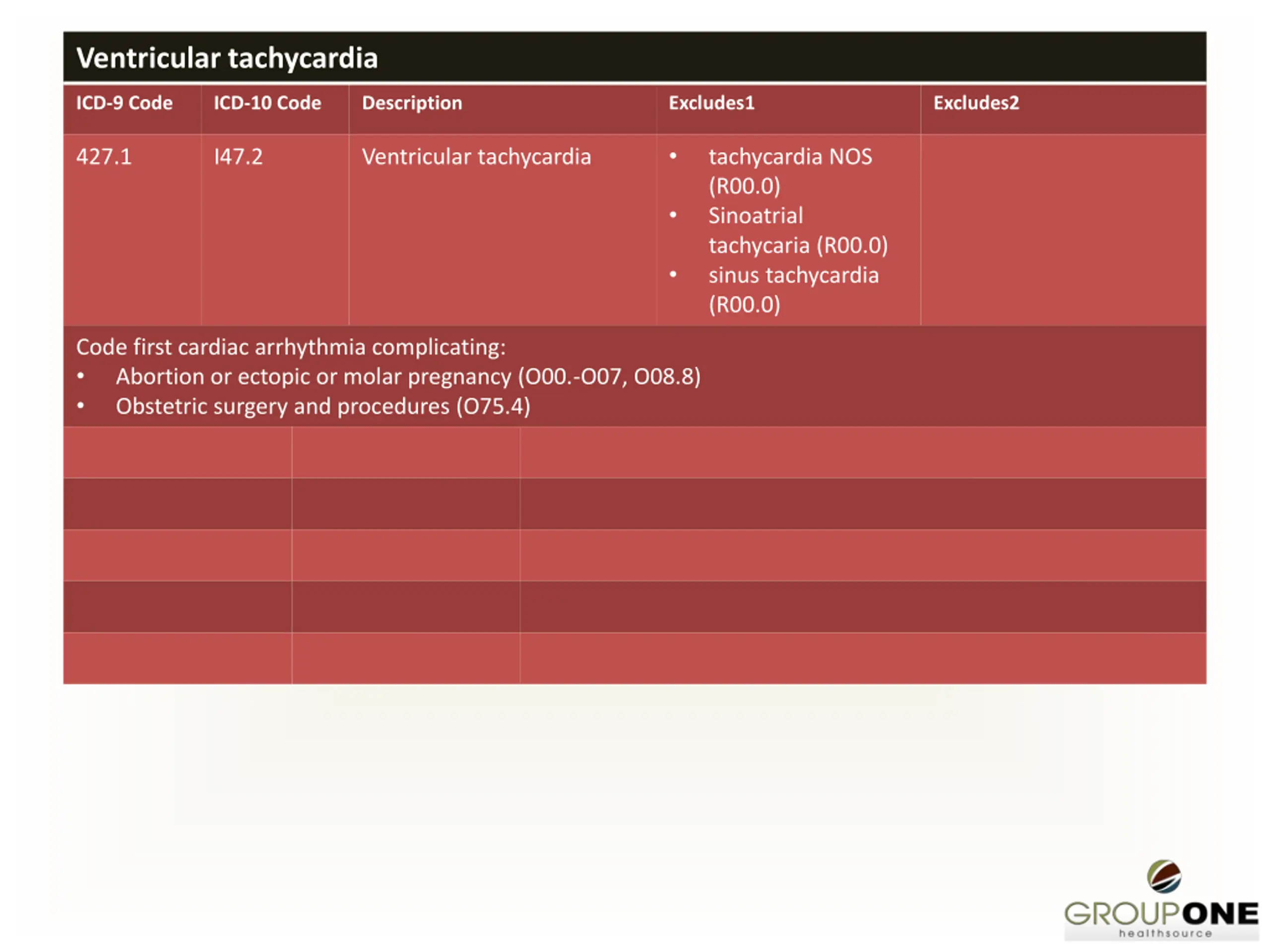 Ventricular tachycardia ICD-9 Code ICD-10 Code Description Excludes1 Excludes2 427.1 I47.2 Ventricular tachycardia tachycardia NOS (R00.0) Sinoatrial tachycaria (R00.0) sinus tachycardia (R00.0) Code first cardiac arrhythmia complicating: Abortion or ectopic or molar pregnancy (O00.-O07, O08.8) Obstetric surgery and procedures (O75.4)