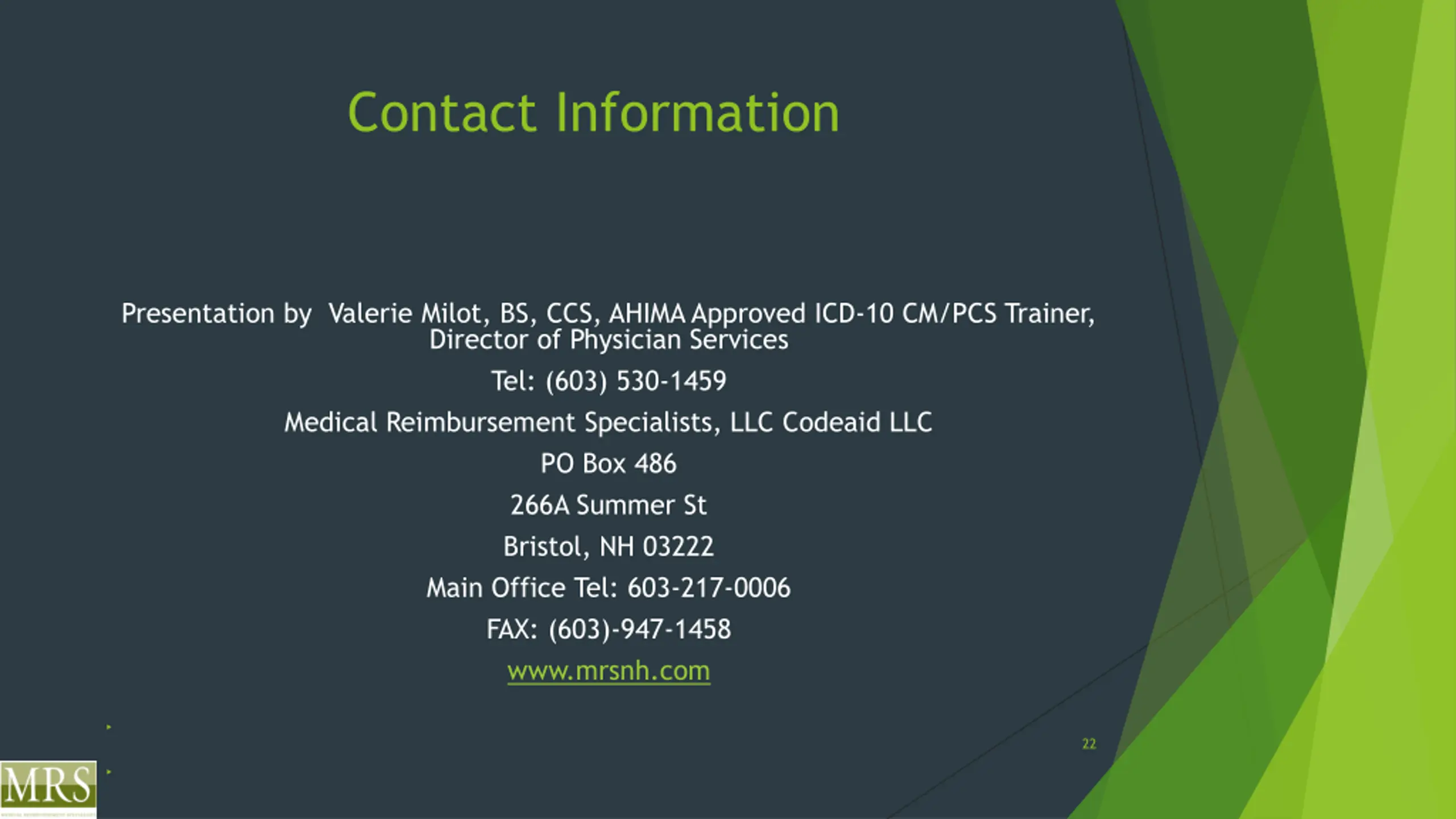Contact Information Presentation by Valerie Milot, BS, CCS, AHIMA Approved ICD-10 CM/PCS Trainer, Director of Physician Services Tel: (603) 530-1459 Medical Reimbursement Specialists, LLC Codeaid LLC PO Box 486 266A Summer St Bristol, NH 03222 Main Office Tel: 603-217-0006 FAX: (603)-947-1458 www.mrsnh.com 22