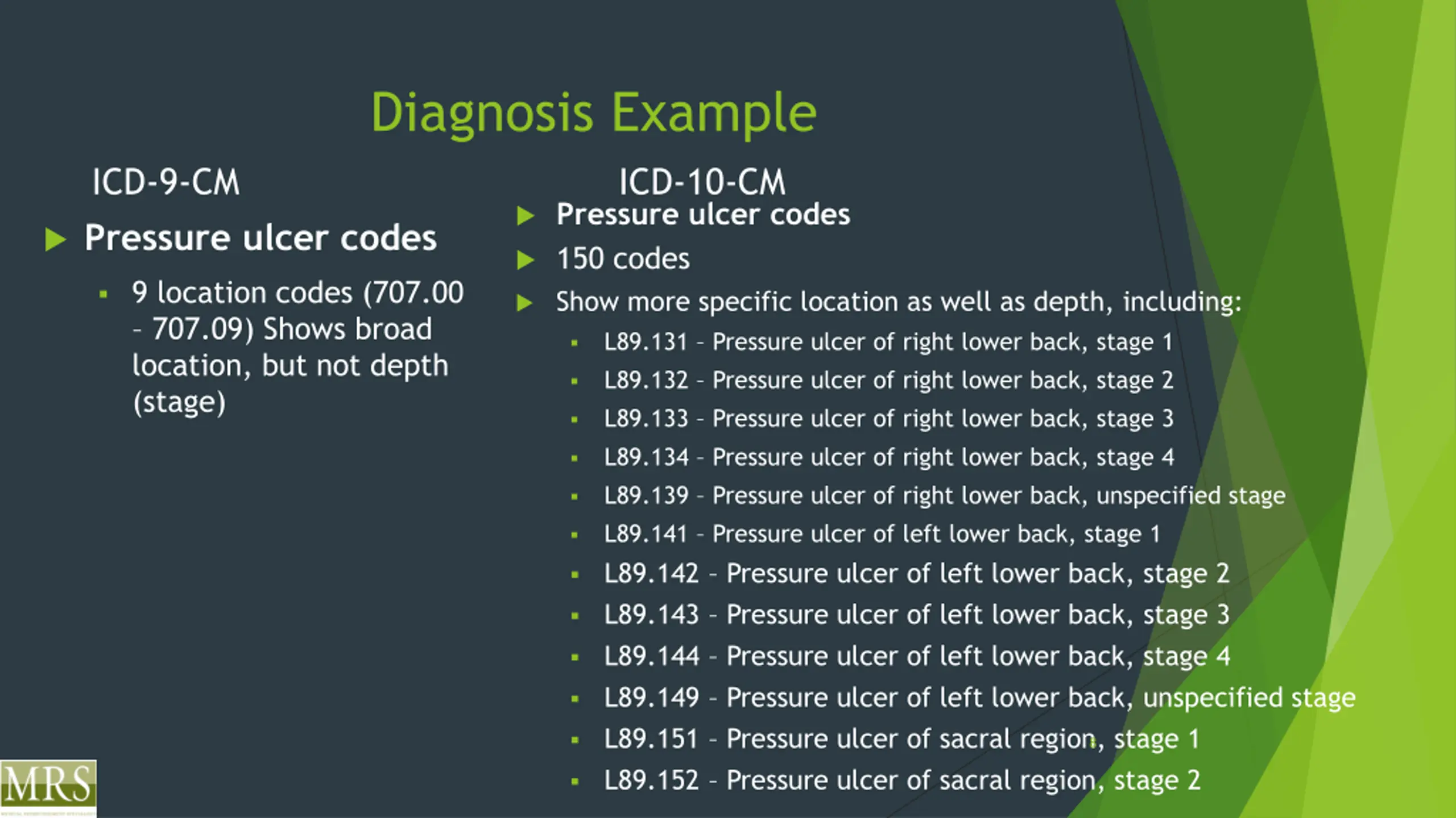 Diagnosis Example ICD-9-CM Pressure ulcer codes ICD-10-CM Pressure ulcer codes 150 codes Show more specific location as well as depth, including: L89.131 Pressure ulcer of right lower back, stage 1 L89.132 Pressure ulcer of right lower back, stage 2 L89.133 Pressure ulcer of right lower back, stage 3 L89.134 Pressure ulcer of right lower back, stage 4 L89.139 Pressure ulcer of right lower back, unspecified stage L89.141 Pressure ulcer of left lower back, stage 1 L89.142 Pressure ulcer of left lower back, stage 2 L89.143 Pressure ulcer of left lower back, stage 3 L89.144 Pressure ulcer of left lower back, stage 4 L89.149 Pressure ulcer of left lower back, unspecified stage L89.151 Pressure ulcer of sacral region, stage 1 L89.152 Pressure ulcer of sacral region, stage 2 9 location codes (707.00 707.09) Shows broad location, but not depth (stage) 8