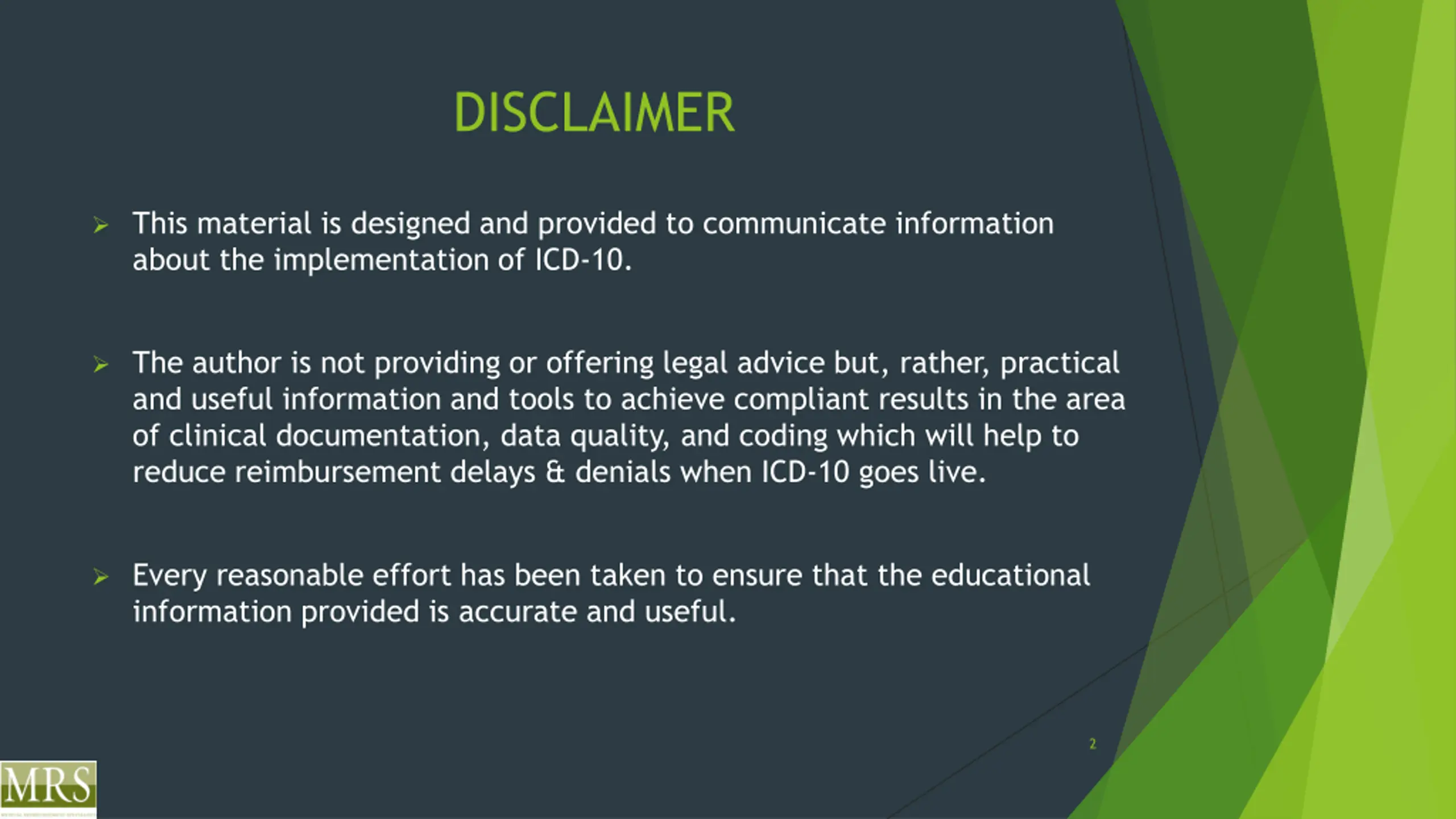 DISCLAIMER This material is designed and provided to communicate information about the implementation of ICD-10. The author is not providing or offering legal advice but, rather, practical and useful information and tools to achieve compliant results in the area of clinical documentation, data quality, and coding which will help to reduce reimbursement delays & denials when ICD-10 goes live. Every reasonable effort has been taken to ensure that the educational information provided is accurate and useful. 2
