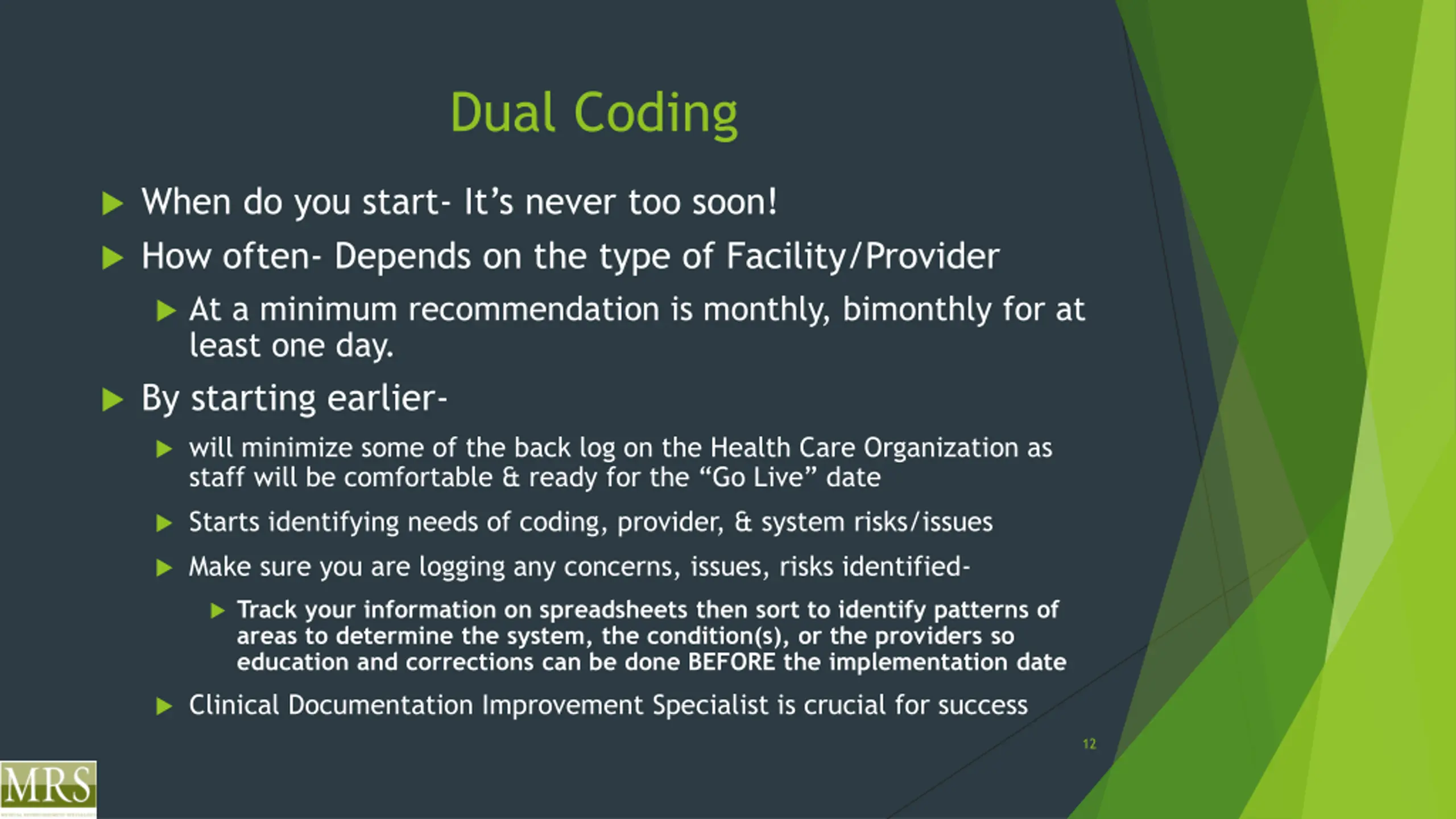 Dual Coding When do you start- It s never too soon! How often- Depends on the type of Facility/Provider At a minimum recommendation is monthly, bimonthly for at least one day. By starting earlier- will minimize some of the back log on the Health Care Organization as staff will be comfortable & ready for the Go Live date Starts identifying needs of coding, provider, & system risks/issues Make sure you are logging any concerns, issues, risks identified- Track your information on spreadsheets then sort to identify patterns of areas to determine the system, the condition(s), or the providers so education and corrections can be done BEFORE the implementation date Clinical Documentation Improvement Specialist is crucial for success 12
