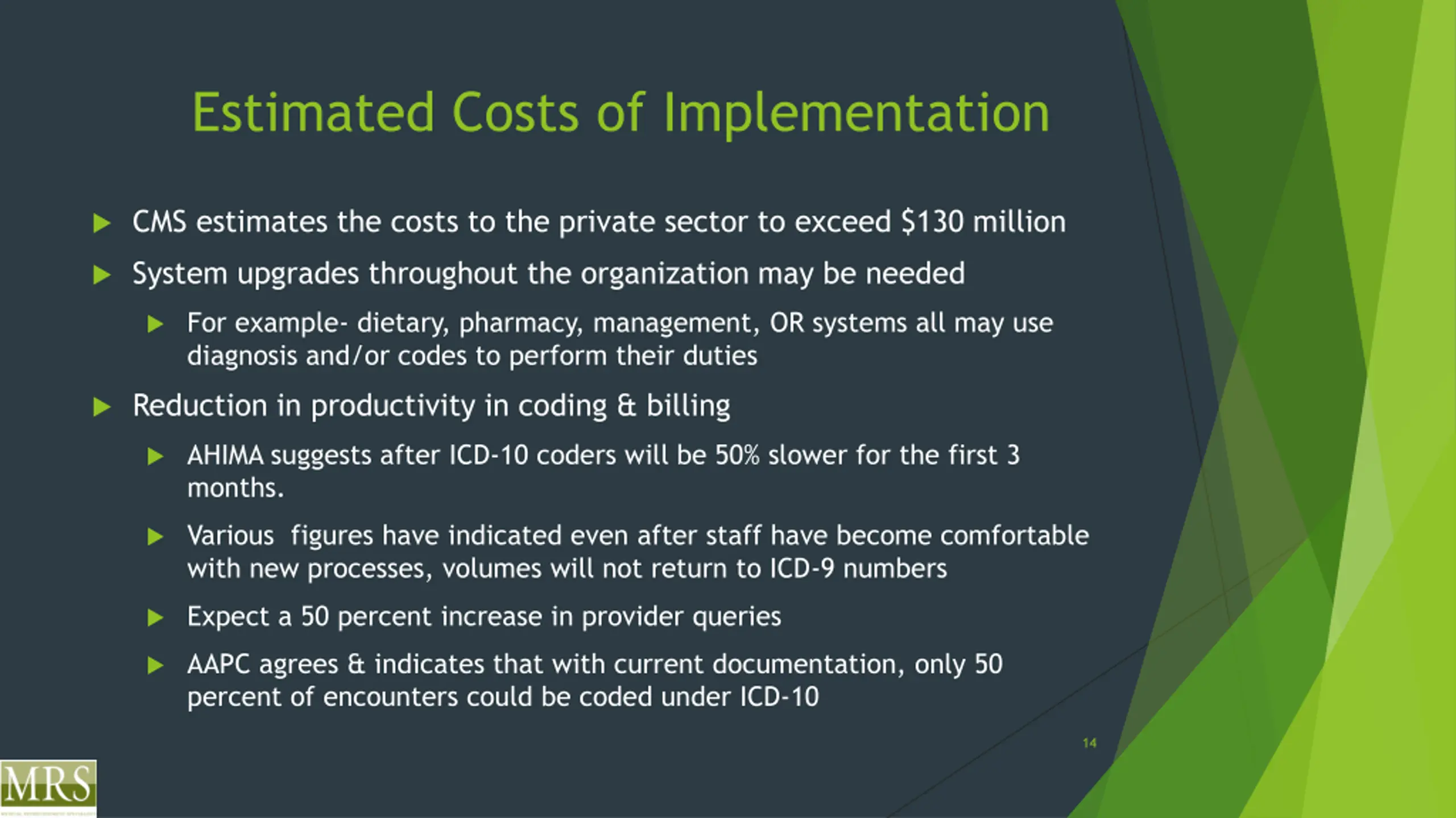 Estimated Costs of Implementation CMS estimates the costs to the private sector to exceed $130 million System upgrades throughout the organization may be needed For example- dietary, pharmacy, management, OR systems all may use diagnosis and/or codes to perform their duties Reduction in productivity in coding & billing AHIMA suggests after ICD-10 coders will be 50% slower for the first 3 months. Various figures have indicated even after staff have become comfortable with new processes, volumes will not return to ICD-9 numbers Expect a 50 percent increase in provider queries AAPC agrees & indicates that with current documentation, only 50 percent of encounters could be coded under ICD-10 14
