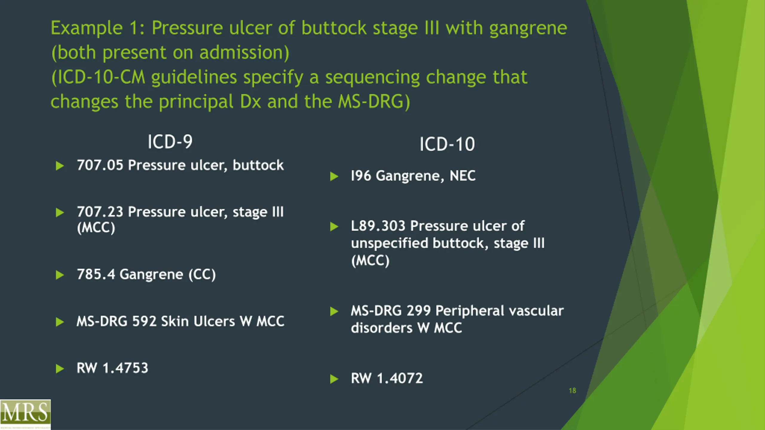 Example 1: Pressure ulcer of buttock stage III with gangrene (both present on admission) (ICD-10-CM guidelines specify a sequencing change that changes the principal Dx and the MS-DRG) ICD-9 ICD-10 707.05 Pressure ulcer, buttock I96 Gangrene, NEC 707.23 Pressure ulcer, stage III (MCC) L89.303 Pressure ulcer of unspecified buttock, stage III (MCC) 785.4 Gangrene (CC) MS-DRG 299 Peripheral vascular disorders W MCC MS-DRG 592 Skin Ulcers W MCC RW 1.4753 RW 1.4072 18