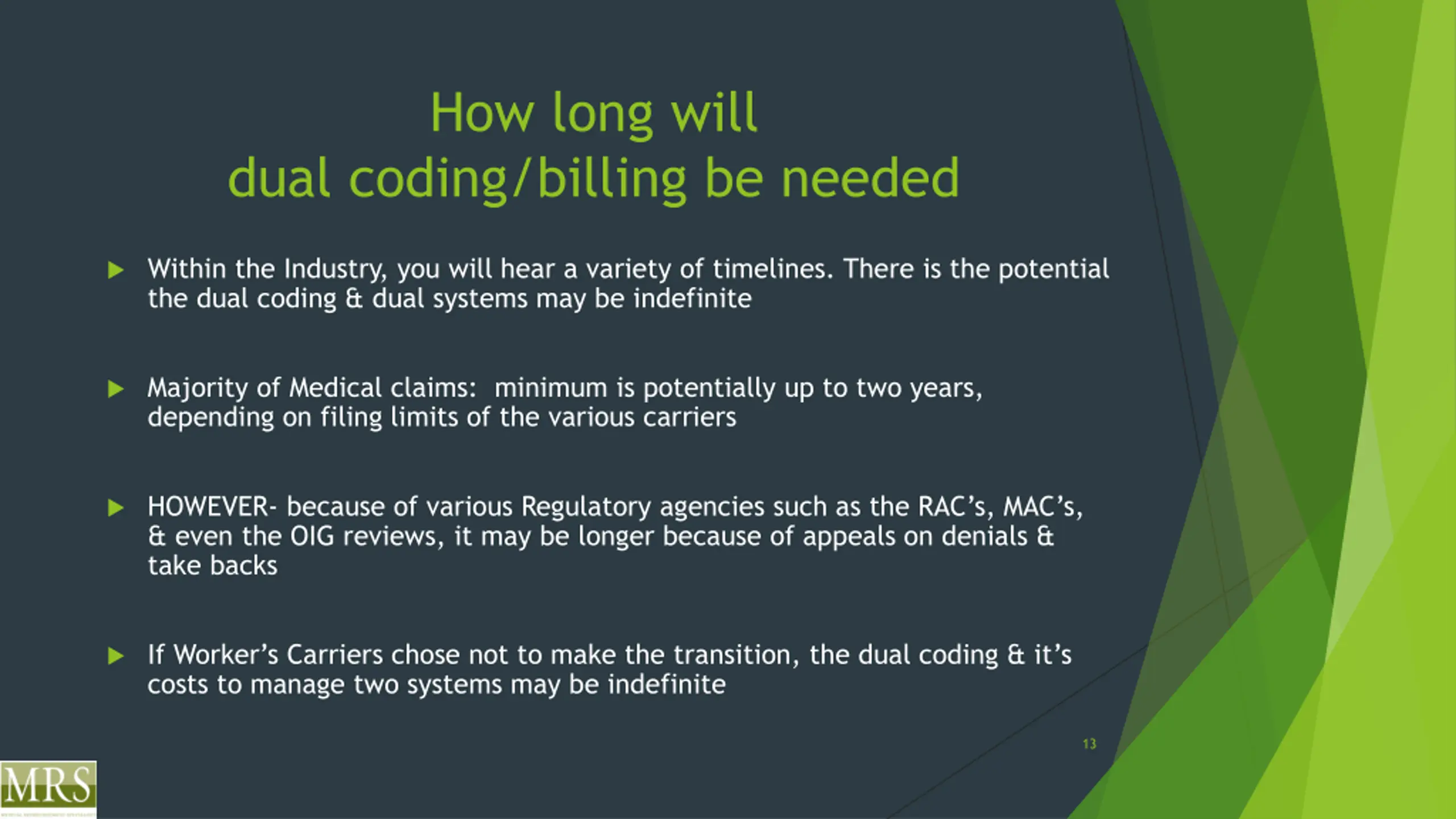 How long will dual coding/billing be needed Within the Industry, you will hear a variety of timelines. There is the potential the dual coding & dual systems may be indefinite Majority of Medical claims: minimum is potentially up to two years, depending on filing limits of the various carriers HOWEVER- because of various Regulatory agencies such as the RAC s, MAC s, & even the OIG reviews, it may be longer because of appeals on denials & take backs If Worker s Carriers chose not to make the transition, the dual coding & it s costs to manage two systems may be indefinite 13