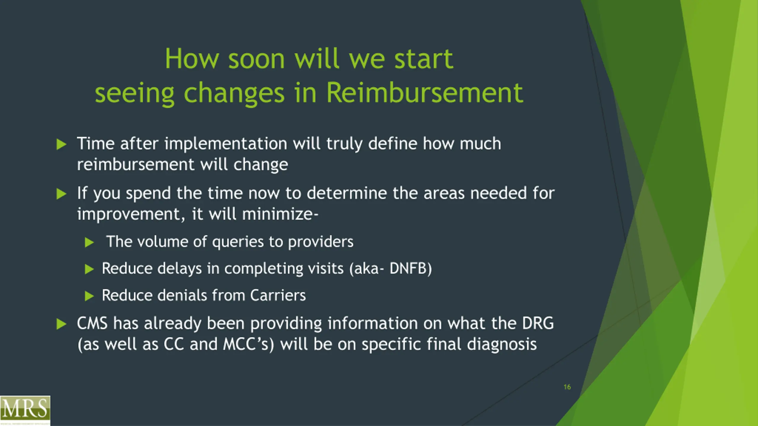 How soon will we start seeing changes in Reimbursement Time after implementation will truly define how much reimbursement will change If you spend the time now to determine the areas needed for improvement, it will minimize- The volume of queries to providers Reduce delays in completing visits (aka- DNFB) Reduce denials from Carriers CMS has already been providing information on what the DRG (as well as CC and MCC s) will be on specific final diagnosis 16