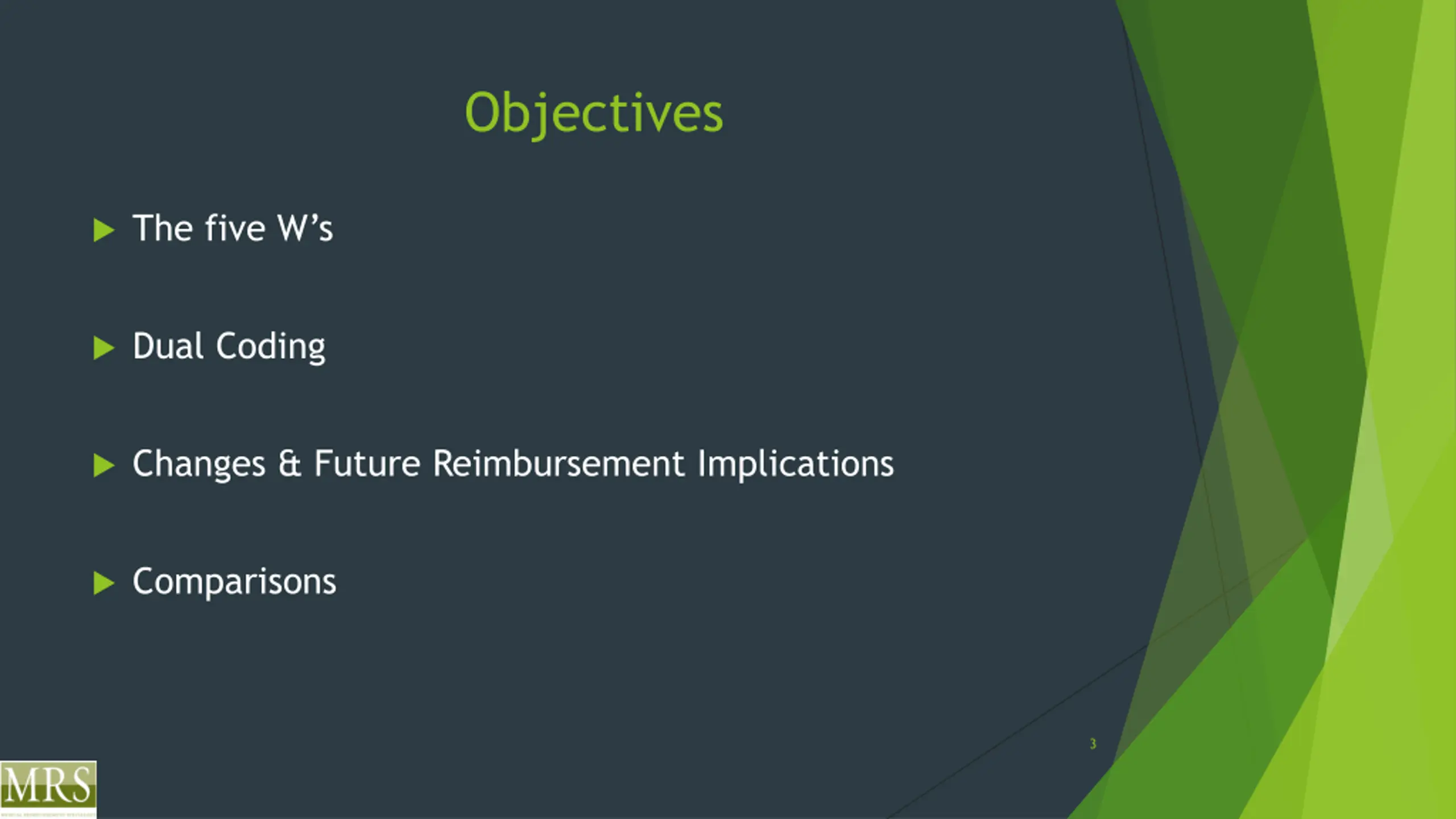 Objectives The five W s Dual Coding Changes & Future Reimbursement Implications Comparisons 3