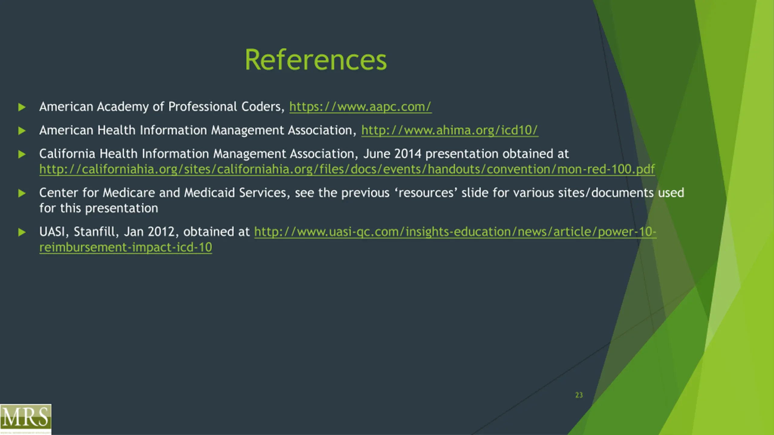 References American Academy of Professional Coders, https://www.aapc.com/ American Health Information Management Association, http://www.ahima.org/icd10/ California Health Information Management Association, June 2014 presentation obtained at http://californiahia.org/sites/californiahia.org/files/docs/events/handouts/convention/mon-red-100.pdf Center for Medicare and Medicaid Services, see the previous resources slide for various sites/documents used for this presentation UASI, Stanfill, Jan 2012, obtained at http://www.uasi-qc.com/insights-education/news/article/power-10- reimbursement-impact-icd-10 23
