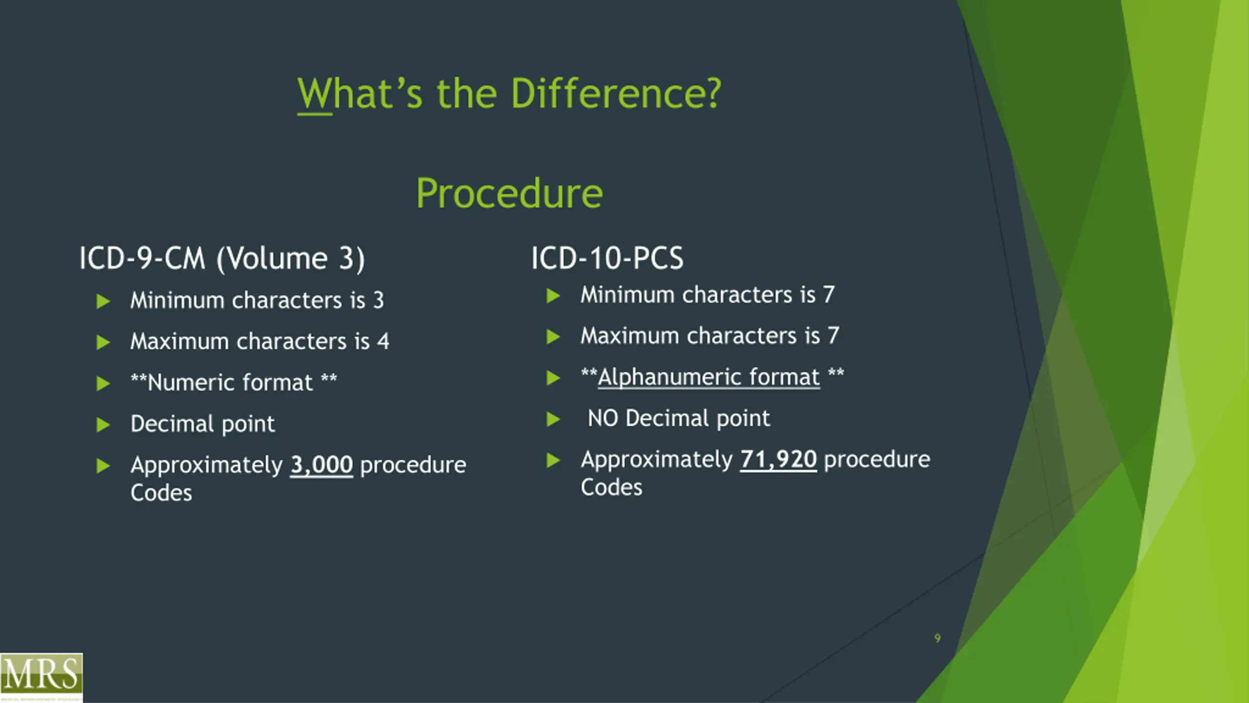 Whats the Difference? Procedure ICD-9-CM (Volume 3) ICD-10-PCS Minimum characters is 7 Minimum characters is 3 Maximum characters is 7 Maximum characters is 4 **Alphanumeric format ** **Numeric format ** NO Decimal point Decimal point Approximately 71,920 procedure Codes Approximately 3,000 procedure Codes 9