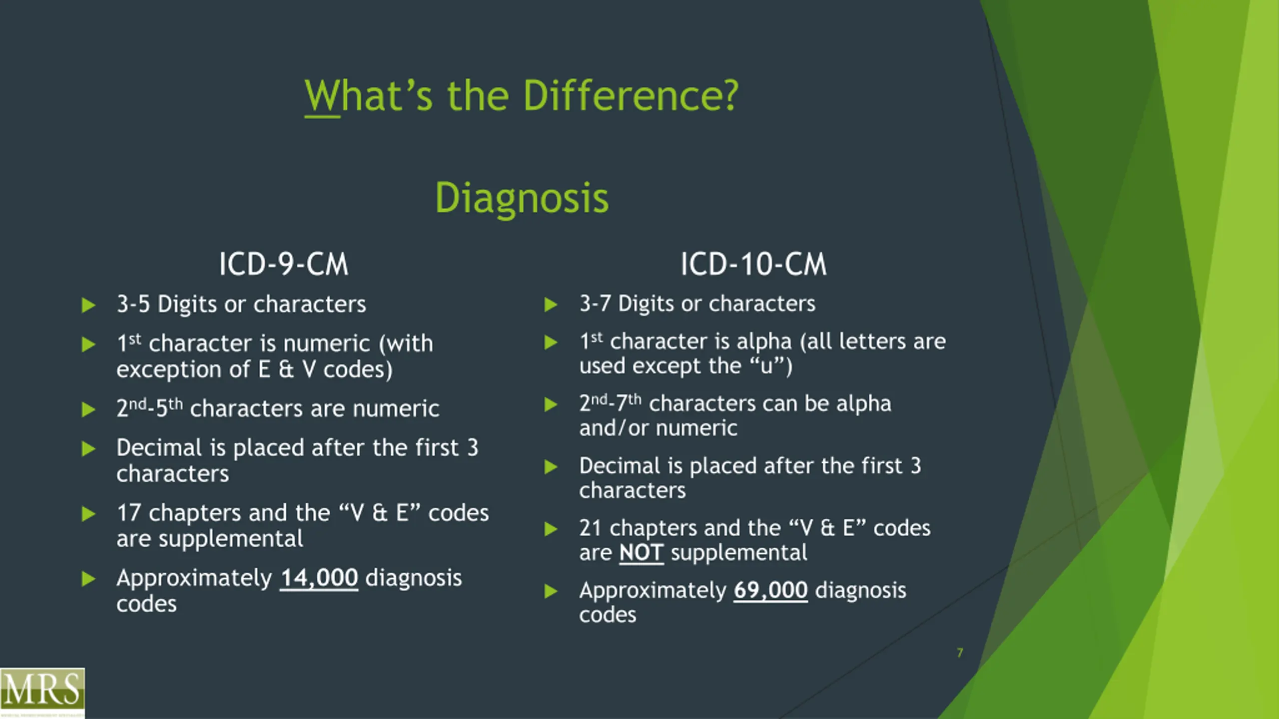 Whats the Difference? Diagnosis ICD-9-CM ICD-10-CM 3-5 Digits or characters 3-7 Digits or characters 1st character is alpha (all letters are used except the u ) 1st character is numeric (with exception of E & V codes) 2nd-7th characters can be alpha and/or numeric 2nd-5th characters are numeric Decimal is placed after the first 3 characters Decimal is placed after the first 3 characters 17 chapters and the V & E codes are supplemental 21 chapters and the V & E codes are NOT supplemental Approximately 14,000 diagnosis codes Approximately 69,000 diagnosis codes 7