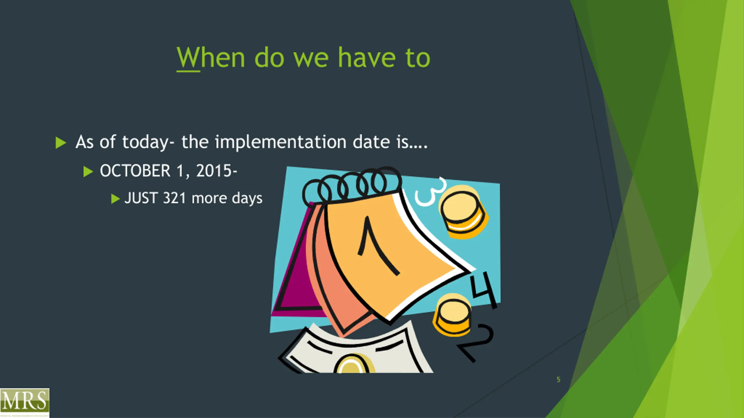 When do we have to As of today- the implementation date is . OCTOBER 1, 2015- JUST 321 more days 5