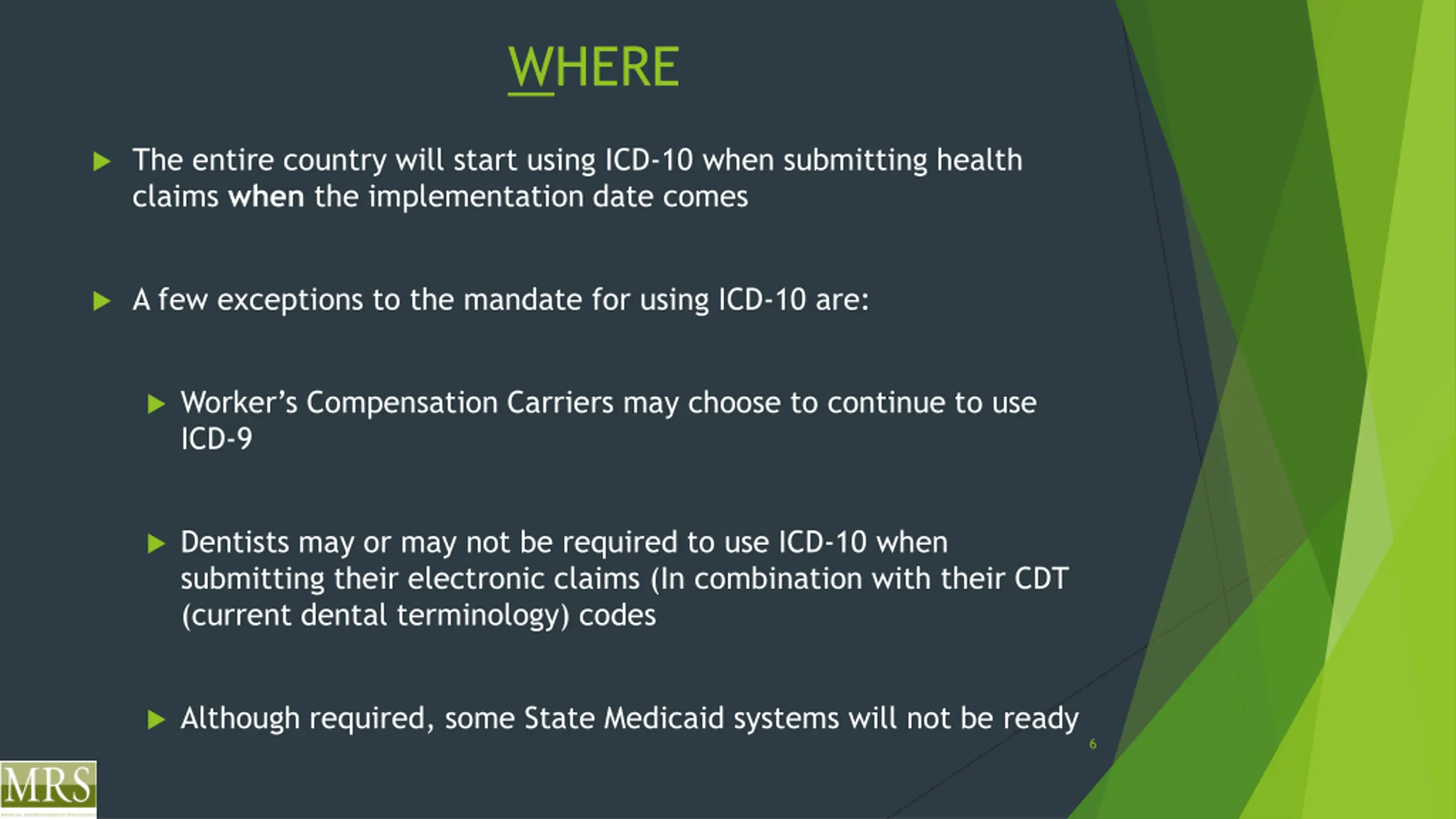 WHERE The entire country will start using ICD-10 when submitting health claims when the implementation date comes A few exceptions to the mandate for using ICD-10 are: Worker s Compensation Carriers may choose to continue to use ICD-9 Dentists may or may not be required to use ICD-10 when submitting their electronic claims (In combination with their CDT (current dental terminology) codes Although required, some State Medicaid systems will not be ready 6
