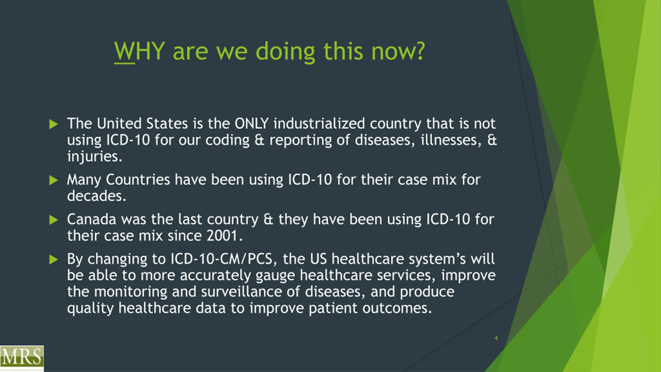 WHY are we doing this now? The United States is the ONLY industrialized country that is not using ICD-10 for our coding & reporting of diseases, illnesses, & injuries. Many Countries have been using ICD-10 for their case mix for decades. Canada was the last country & they have been using ICD-10 for their case mix since 2001. By changing to ICD-10-CM/PCS, the US healthcare system s will be able to more accurately gauge healthcare services, improve the monitoring and surveillance of diseases, and produce quality healthcare data to improve patient outcomes. 4