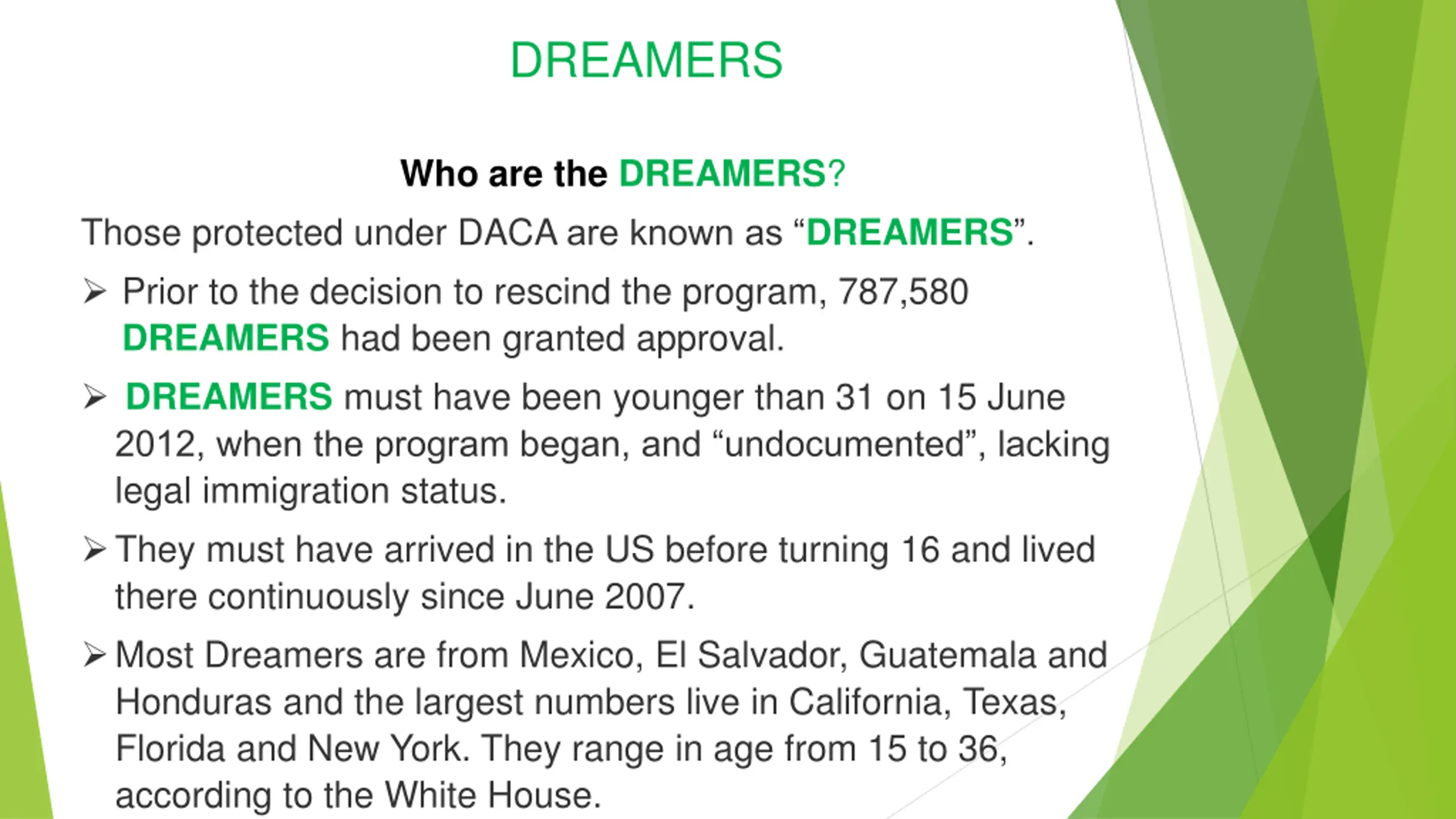 DREAMERS Who are the DREAMERS? Those protected under DACA are known as DREAMERS . Prior to the decision to rescind the program, 787,580 DREAMERS had been granted approval. DREAMERS must have been younger than 31 on 15 June 2012, when the program began, and undocumented , lacking legal immigration status. They must have arrived in the US before turning 16 and lived there continuously since June 2007. Most Dreamers are from Mexico, El Salvador, Guatemala and Honduras and the largest numbers live in California, Texas, Florida and New York. They range in age from 15 to 36, according to the White House.