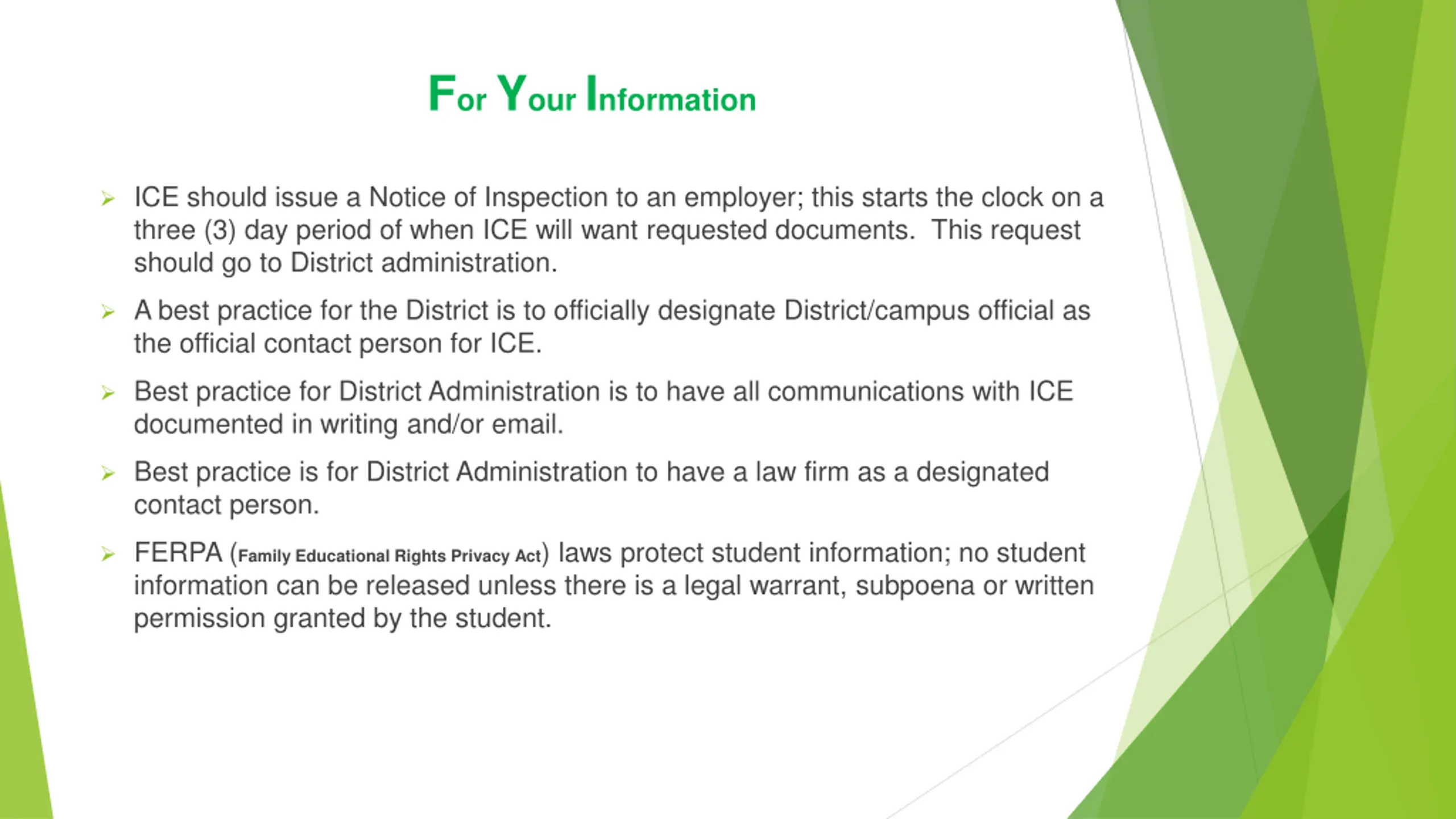 For Your Information ICE should issue a Notice of Inspection to an employer; this starts the clock on a three (3) day period of when ICE will want requested documents. This request should go to District administration. A best practice for the District is to officially designate District/campus official as the official contact person for ICE. Best practice for District Administration is to have all communications with ICE documented in writing and/or email. Best practice is for District Administration to have a law firm as a designated contact person. FERPA (Family Educational Rights Privacy Act) laws protect student information; no student information can be released unless there is a legal warrant, subpoena or written permission granted by the student.