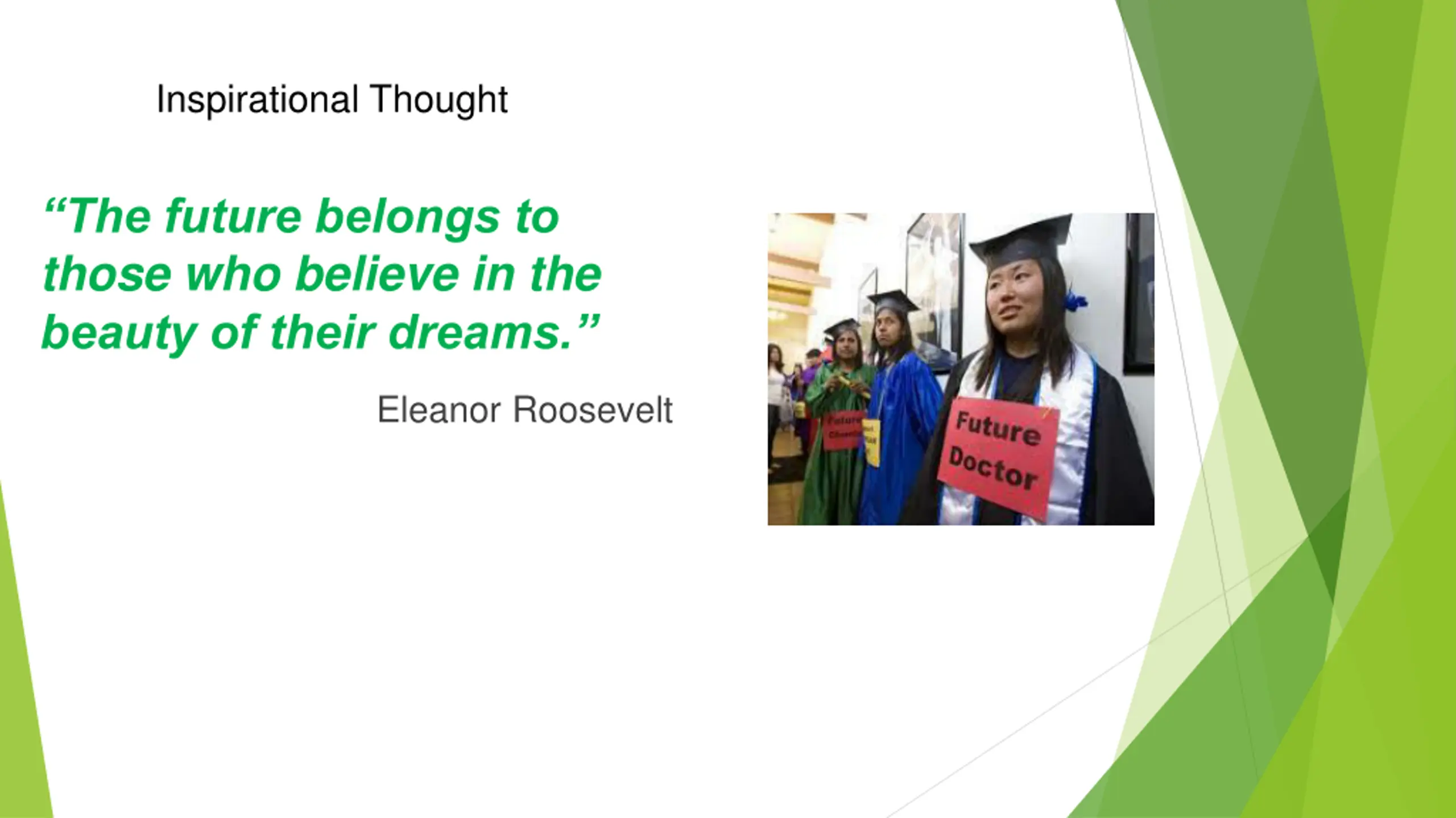 Inspirational Thought The future belongs to those who believe in the beauty of their dreams. Eleanor Roosevelt
