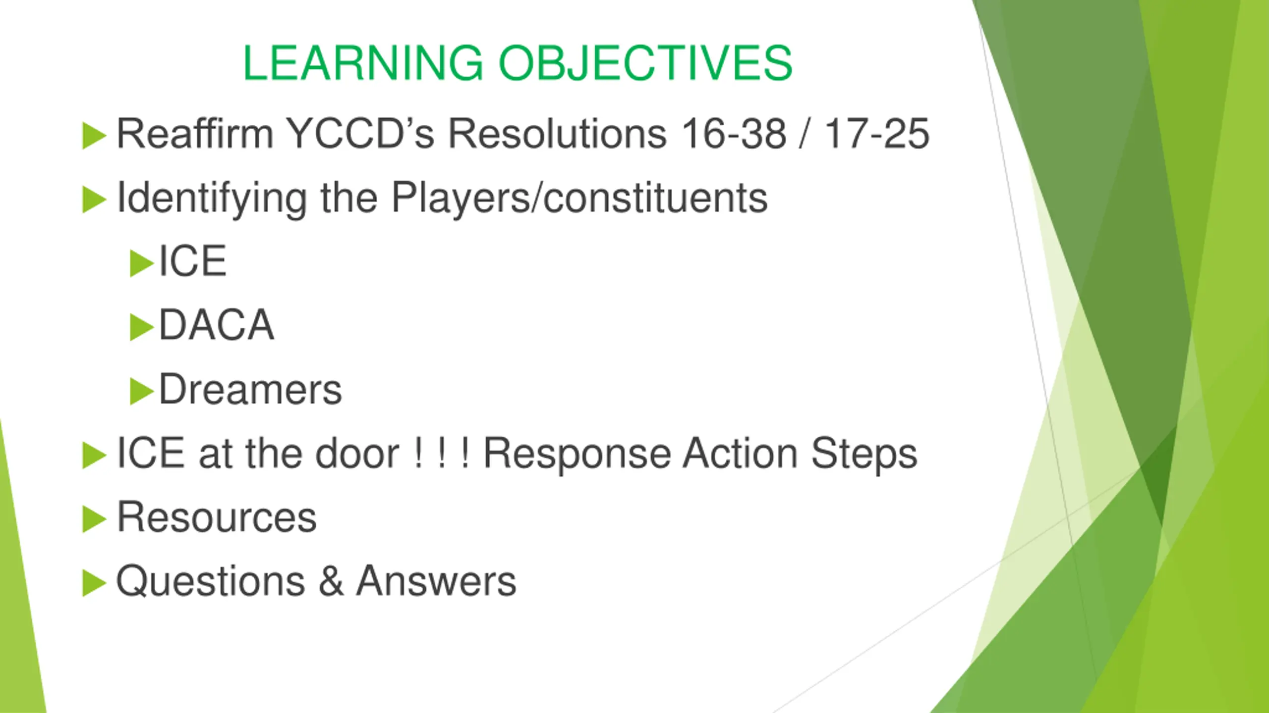 LEARNING OBJECTIVES Reaffirm YCCD s Resolutions 16-38 / 17-25 Identifying the Players/constituents ICE DACA Dreamers ICE at the door ! ! ! Response Action Steps Resources Questions & Answers