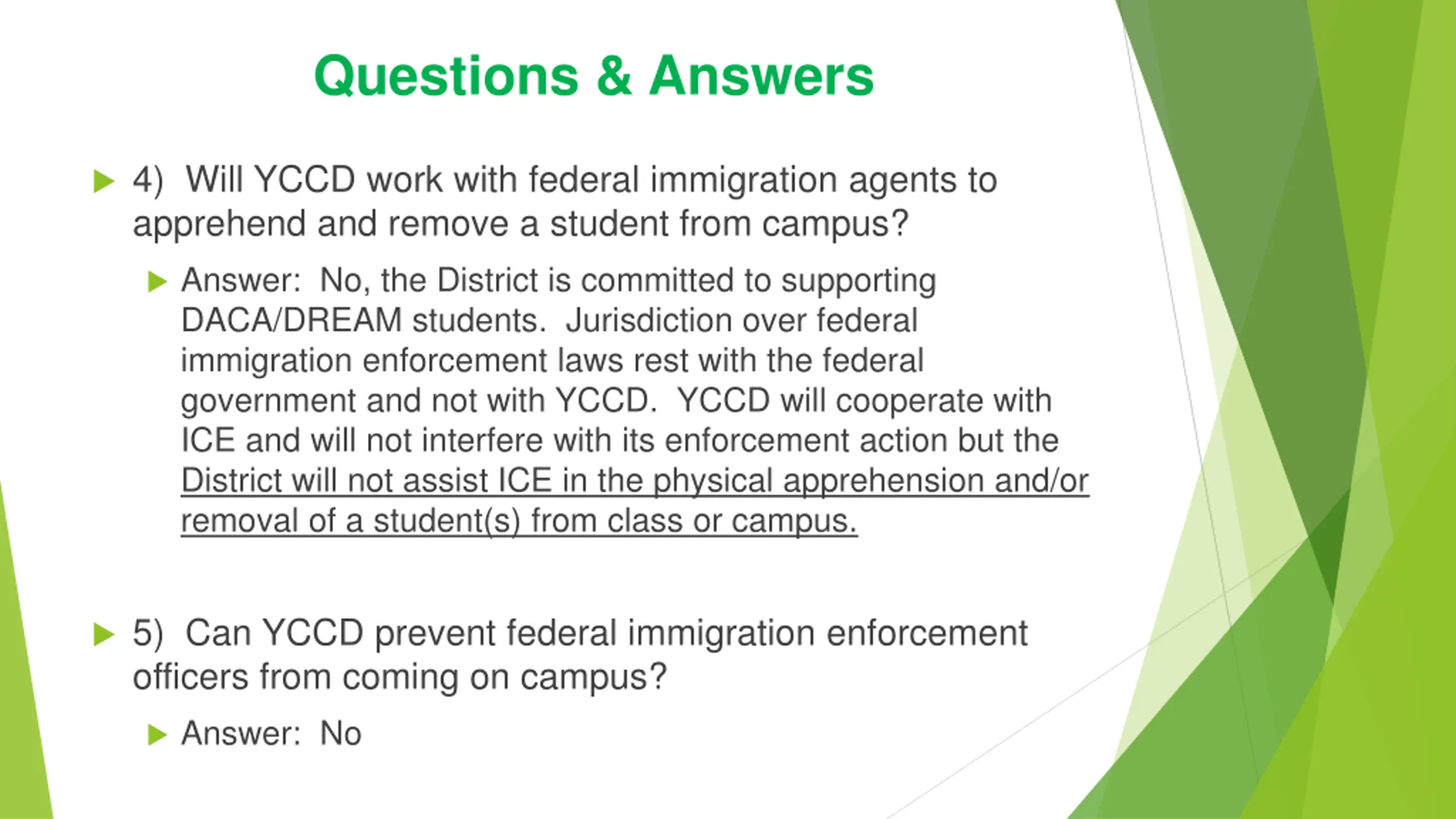 Questions & Answers 4) Will YCCD work with federal immigration agents to apprehend and remove a student from campus? Answer: No, the District is committed to supporting DACA/DREAM students. Jurisdiction over federal immigration enforcement laws rest with the federal government and not with YCCD. YCCD will cooperate with ICE and will not interfere with its enforcement action but the District will not assist ICE in the physical apprehension and/or removal of a student(s) from class or campus. 5) Can YCCD prevent federal immigration enforcement officers from coming on campus? Answer: No