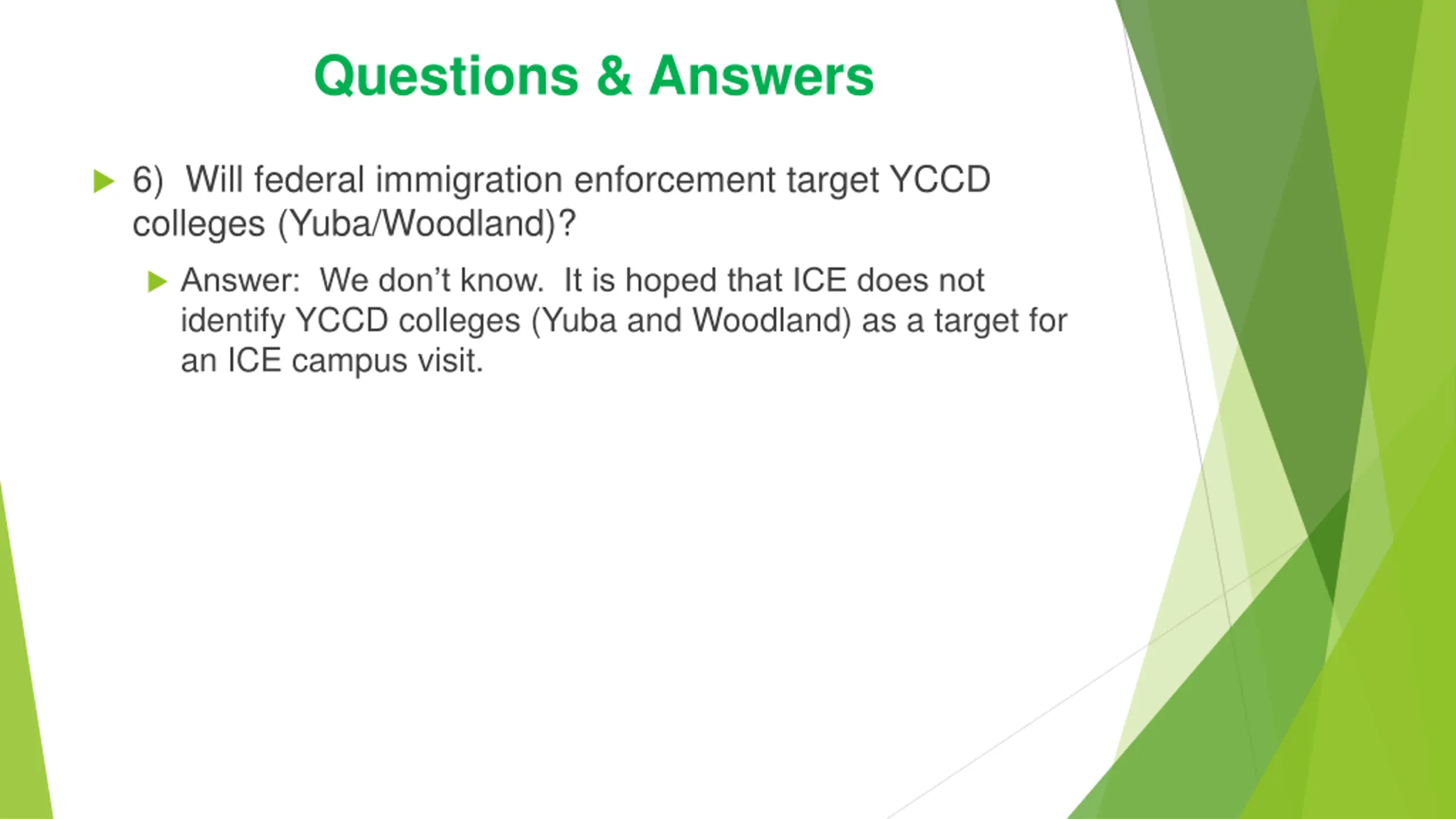 Questions & Answers 6) Will federal immigration enforcement target YCCD colleges (Yuba/Woodland)? Answer: We don t know. It is hoped that ICE does not identify YCCD colleges (Yuba and Woodland) as a target for an ICE campus visit.