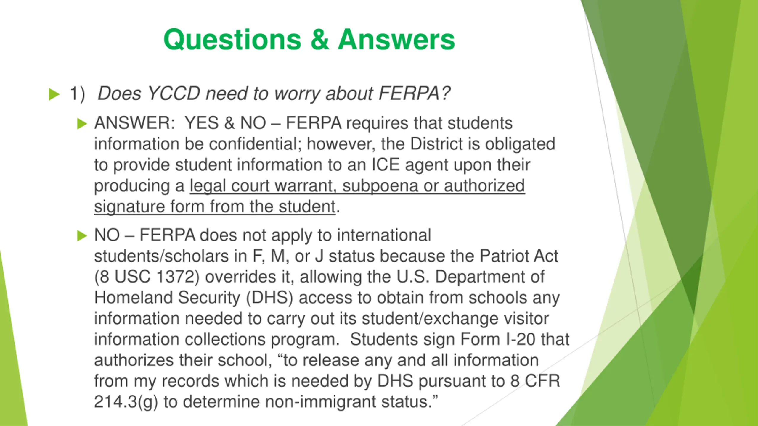 Questions & Answers 1) Does YCCD need to worry about FERPA? ANSWER: YES & NO FERPA requires that students information be confidential; however, the District is obligated to provide student information to an ICE agent upon their producing a legal court warrant, subpoena or authorized signature form from the student. NO FERPA does not apply to international students/scholars in F, M, or J status because the Patriot Act (8 USC 1372) overrides it, allowing the U.S. Department of Homeland Security (DHS) access to obtain from schools any information needed to carry out its student/exchange visitor information collections program. Students sign Form I-20 that authorizes their school, to release any and all information from my records which is needed by DHS pursuant to 8 CFR 214.3(g) to determine non-immigrant status.