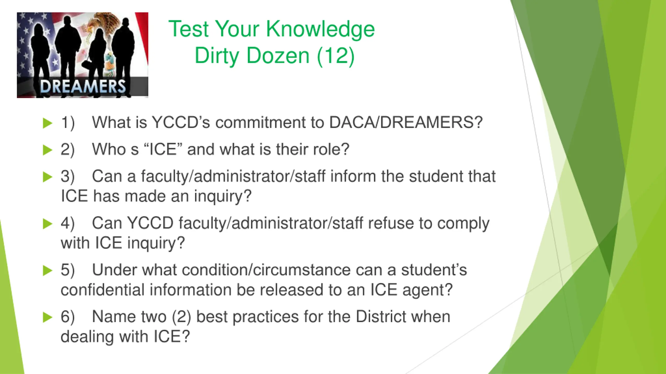 Test Your Knowledge Dirty Dozen (12) 1) What is YCCD s commitment to DACA/DREAMERS? 2) Who s ICE and what is their role? 3) Can a faculty/administrator/staff inform the student that ICE has made an inquiry? 4) Can YCCD faculty/administrator/staff refuse to comply with ICE inquiry? 5) Under what condition/circumstance can a student s confidential information be released to an ICE agent? 6) Name two (2) best practices for the District when dealing with ICE?