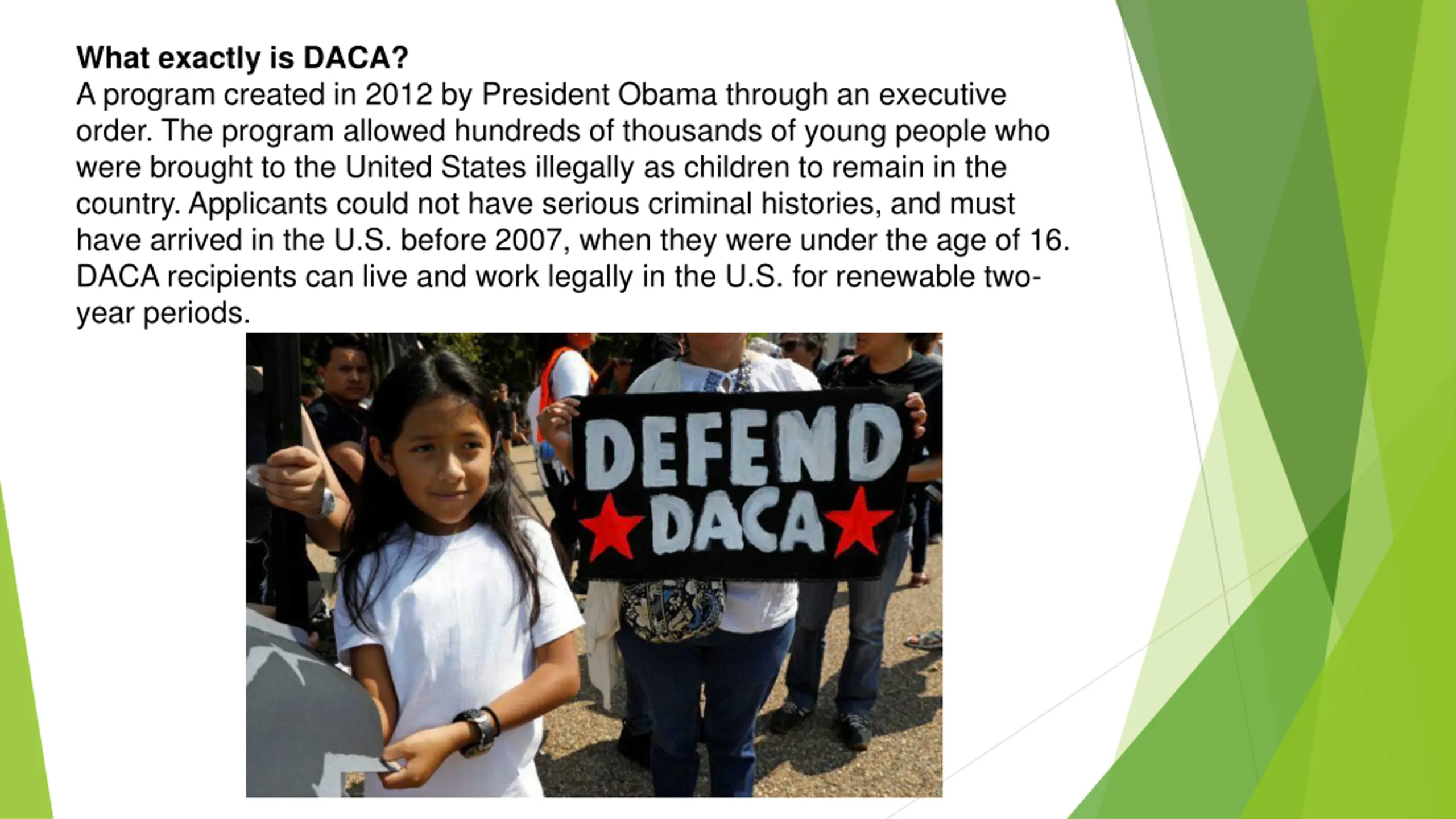 What exactly is DACA? A program created in 2012 by President Obama through an executive order. The program allowed hundreds of thousands of young people who were brought to the United States illegally as children to remain in the country. Applicants could not have serious criminal histories, and must have arrived in the U.S. before 2007, when they were under the age of 16. DACA recipients can live and work legally in the U.S. for renewable two- year periods.