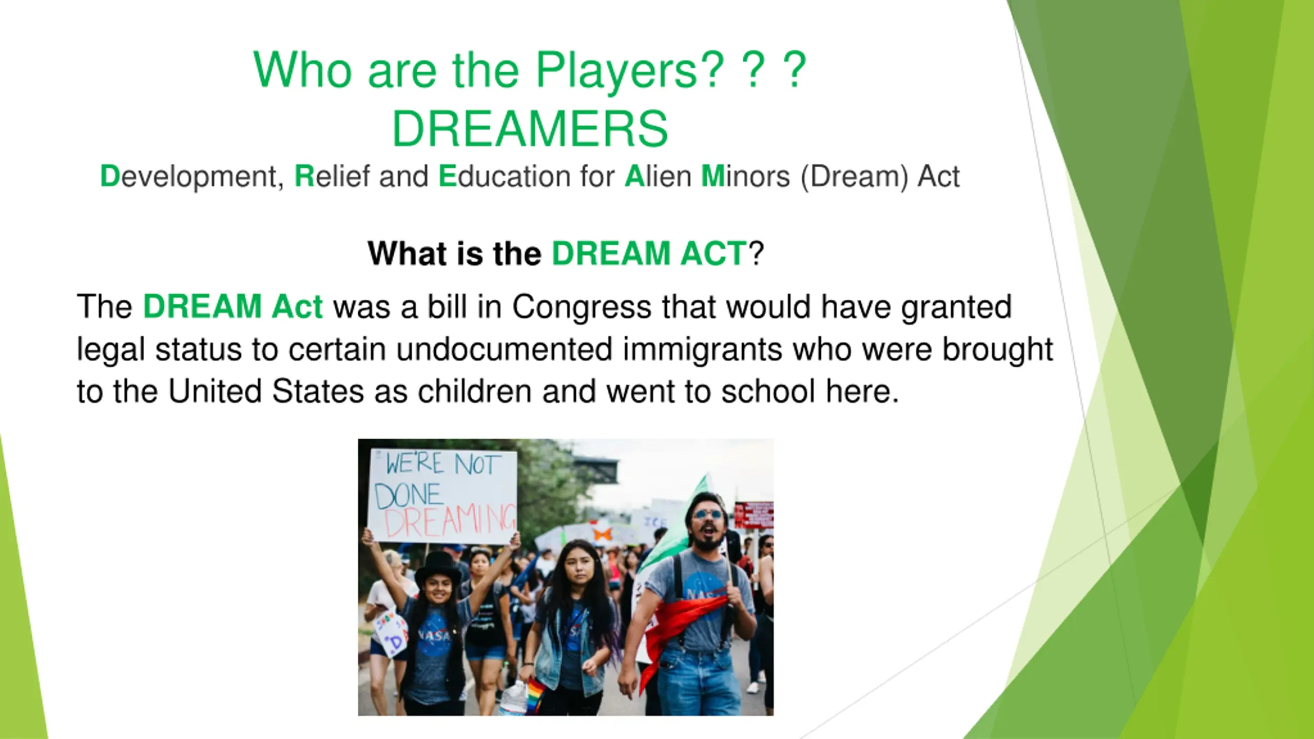 Who are the Players? ? ? DREAMERS Development, Relief and Education for Alien Minors (Dream) Act What is the DREAM ACT? The DREAM Act was a bill in Congress that would have granted legal status to certain undocumented immigrants who were brought to the United States as children and went to school here.