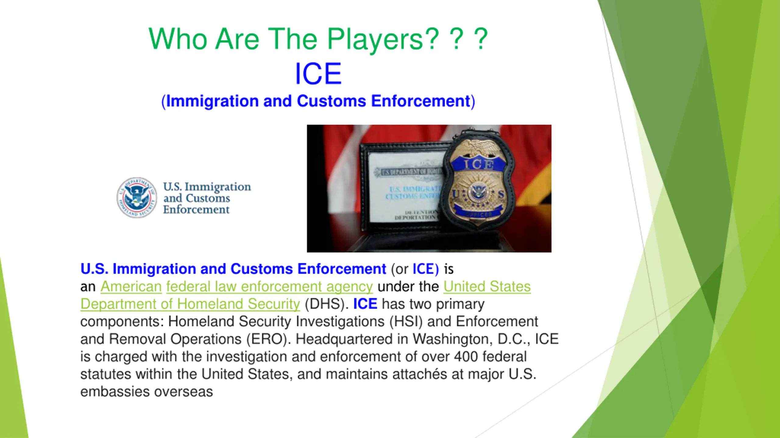 Who Are The Players? ? ? ICE (Immigration and Customs Enforcement) U.S. Immigration and Customs Enforcement (or ICE) is an American federal law enforcement agency under the United States Department of Homeland Security (DHS). ICE has two primary components: Homeland Security Investigations (HSI) and Enforcement and Removal Operations (ERO). Headquartered in Washington, D.C., ICE is charged with the investigation and enforcement of over 400 federal statutes within the United States, and maintains attach s at major U.S. embassies overseas