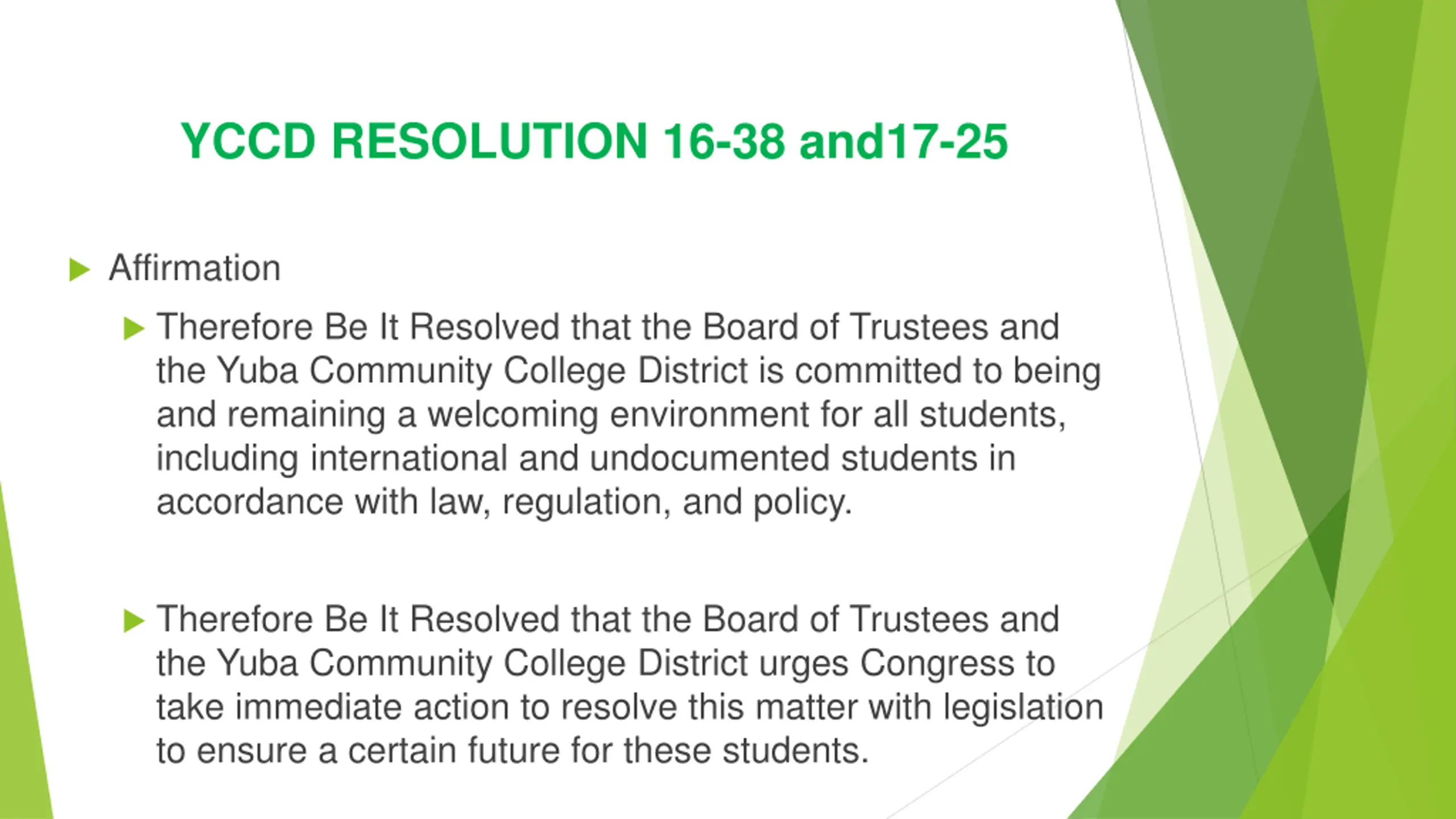 YCCD RESOLUTION 16-38 and17-25 Affirmation Therefore Be It Resolved that the Board of Trustees and the Yuba Community College District is committed to being and remaining a welcoming environment for all students, including international and undocumented students in accordance with law, regulation, and policy. Therefore Be It Resolved that the Board of Trustees and the Yuba Community College District urges Congress to take immediate action to resolve this matter with legislation to ensure a certain future for these students.