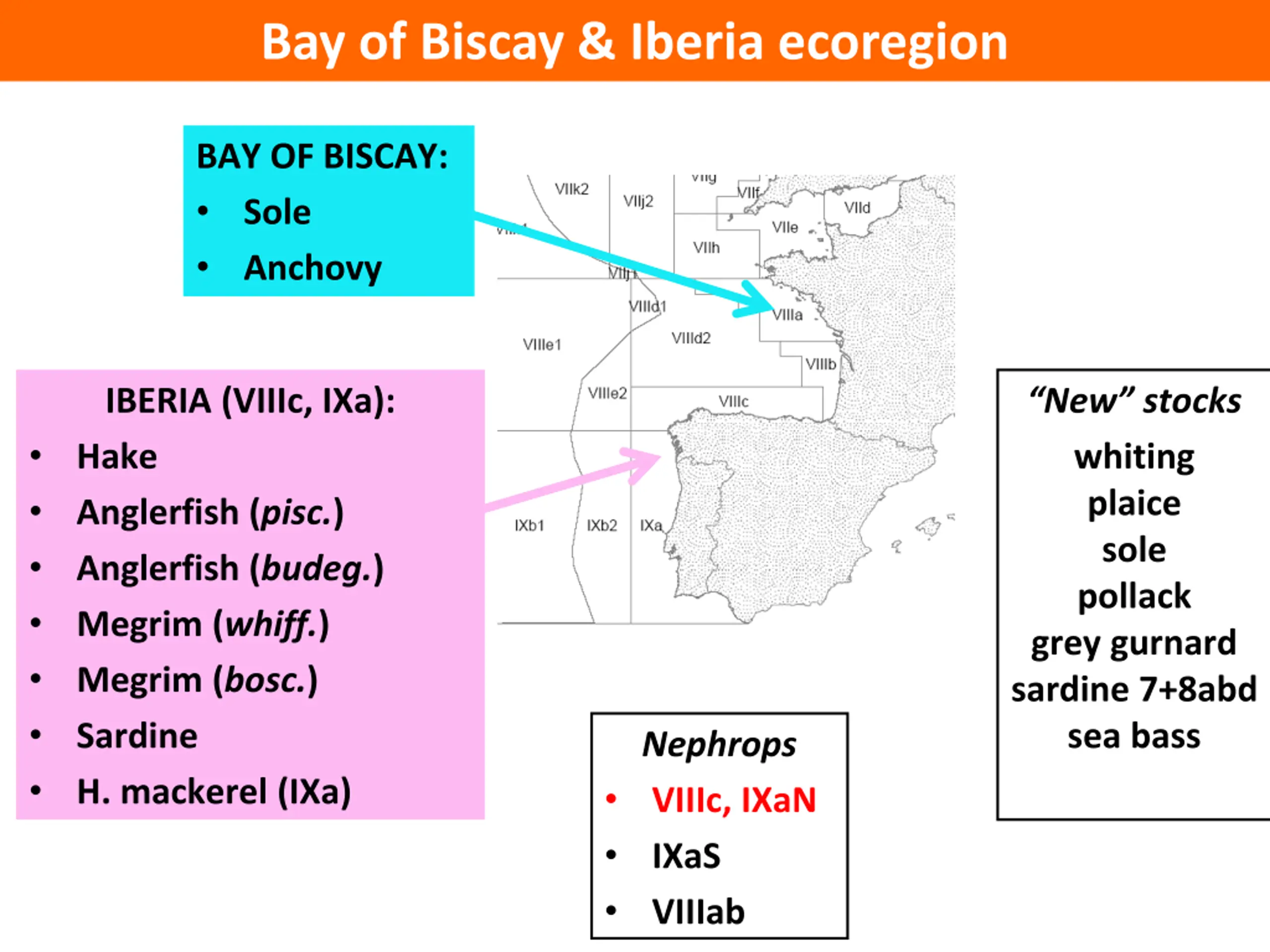 Bay of Biscay & Iberia ecoregion BAY OF BISCAY: Sole Anchovy IBERIA (VIIIc, IXa): Hake Anglerfish (pisc.) Anglerfish (budeg.) Megrim (whiff.) Megrim (bosc.) Sardine H. mackerel (IXa) New stocks whiting plaice sole pollack grey gurnard sardine 7+8abd sea bass Nephrops VIIIc, IXaN IXaS VIIIab