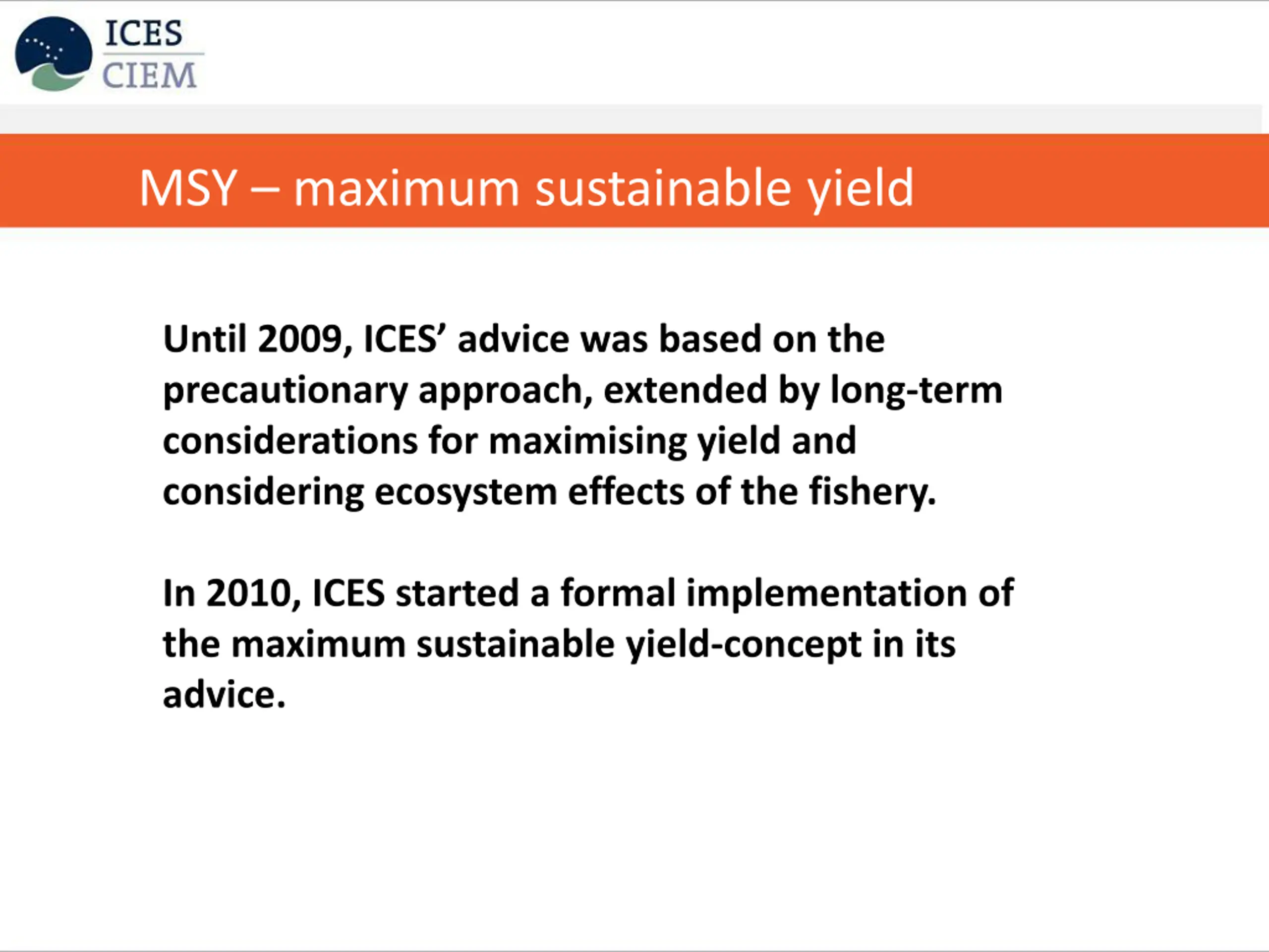 MSY maximum sustainable yield Until 2009, ICES advice was based on the precautionary approach, extended by long-term considerations for maximising yield and considering ecosystem effects of the fishery. In 2010, ICES started a formal implementation of the maximum sustainable yield-concept in its advice.