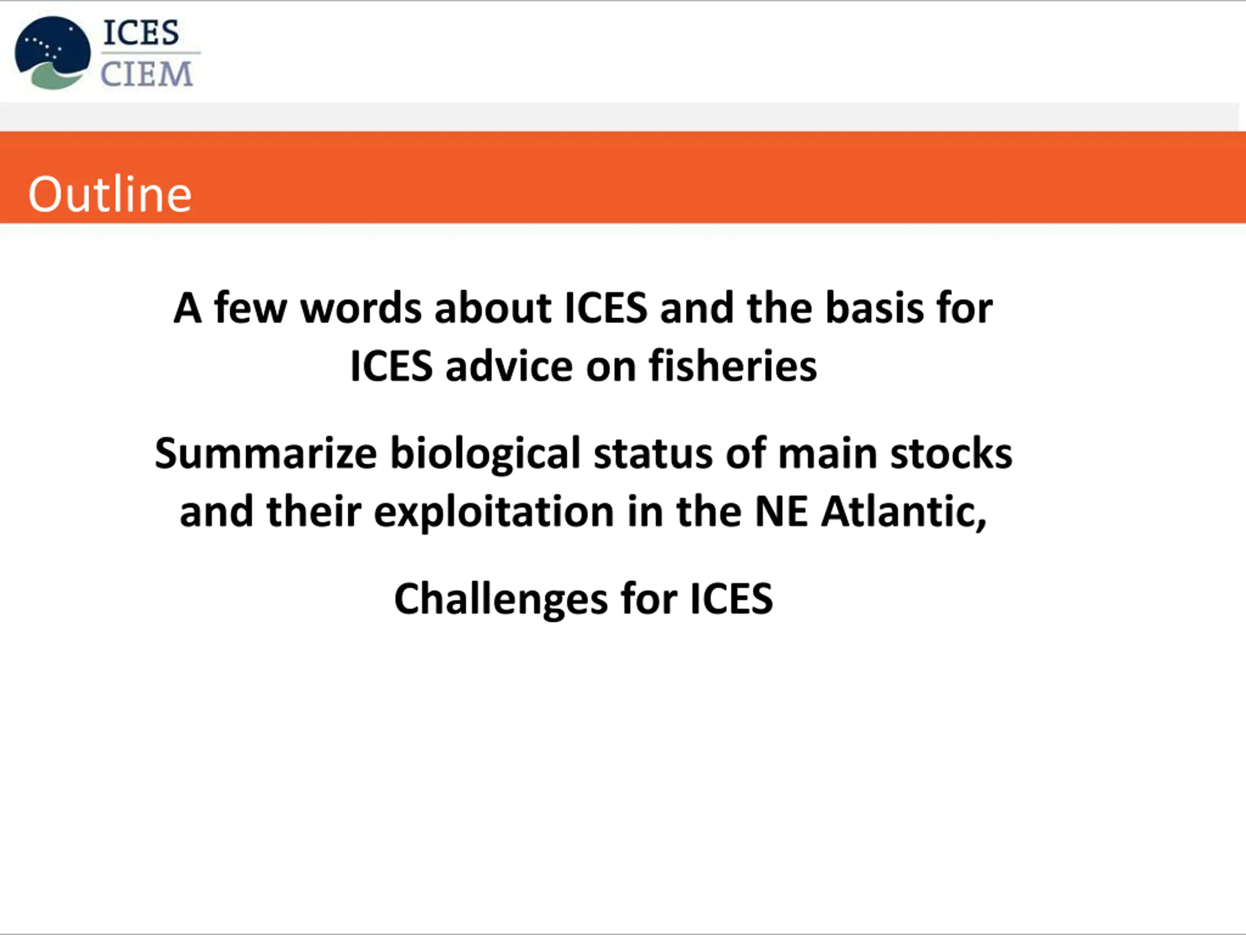 Outline A few words about ICES and the basis for ICES advice on fisheries Summarize biological status of main stocks and their exploitation in the NE Atlantic, Challenges for ICES