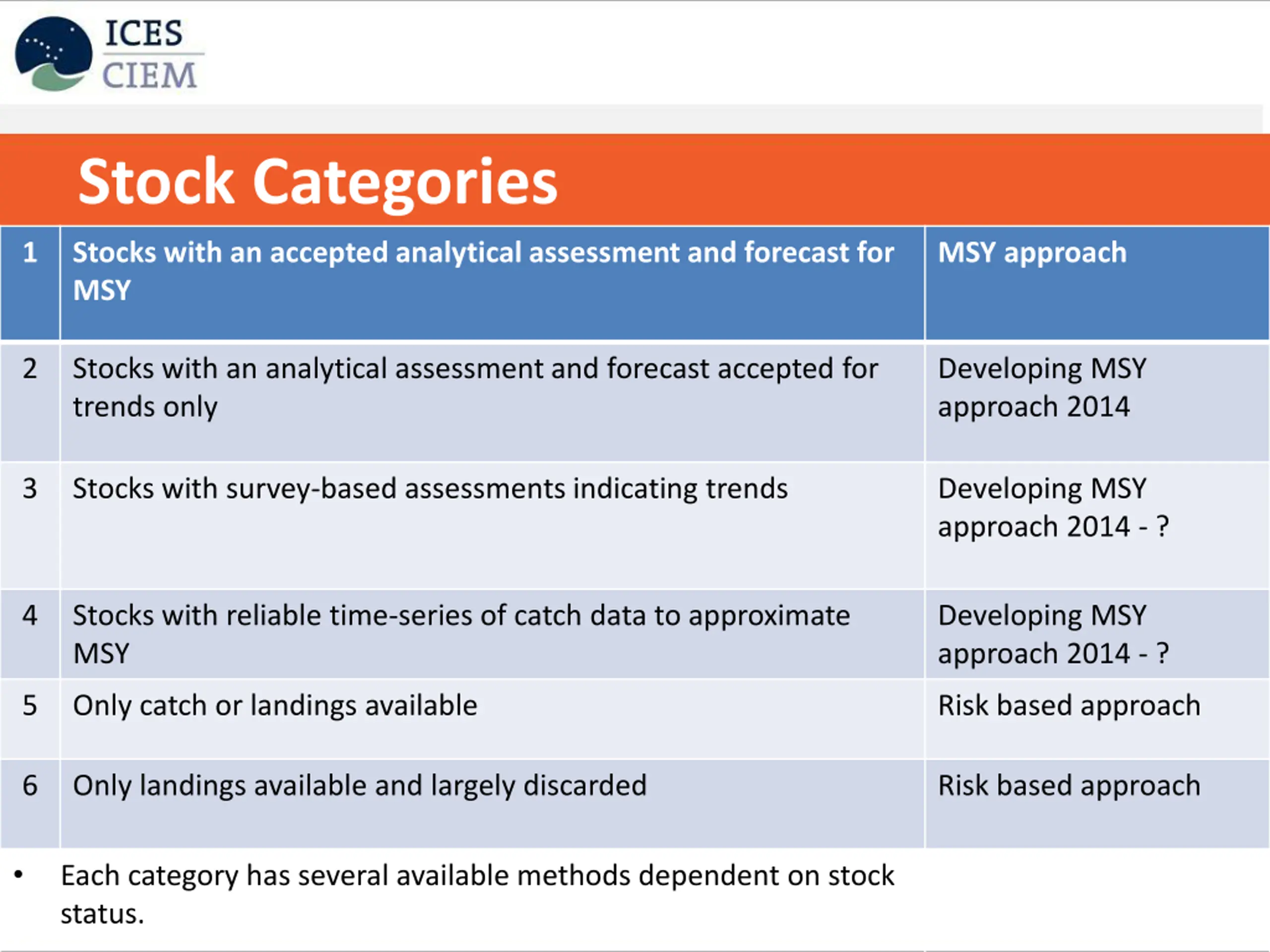 Stock Categories 1 Stocks with an accepted analytical assessment and forecast for MSY MSY approach 2 Stocks with an analytical assessment and forecast accepted for trends only Developing MSY approach 2014 3 Stocks with survey-based assessments indicating trends Developing MSY approach 2014 - ? 4 Stocks with reliable time-series of catch data to approximate MSY Developing MSY approach 2014 - ? 5 Only catch or landings available Risk based approach 6 Only landings available and largely discarded Risk based approach Each category has several available methods dependent on stock status.