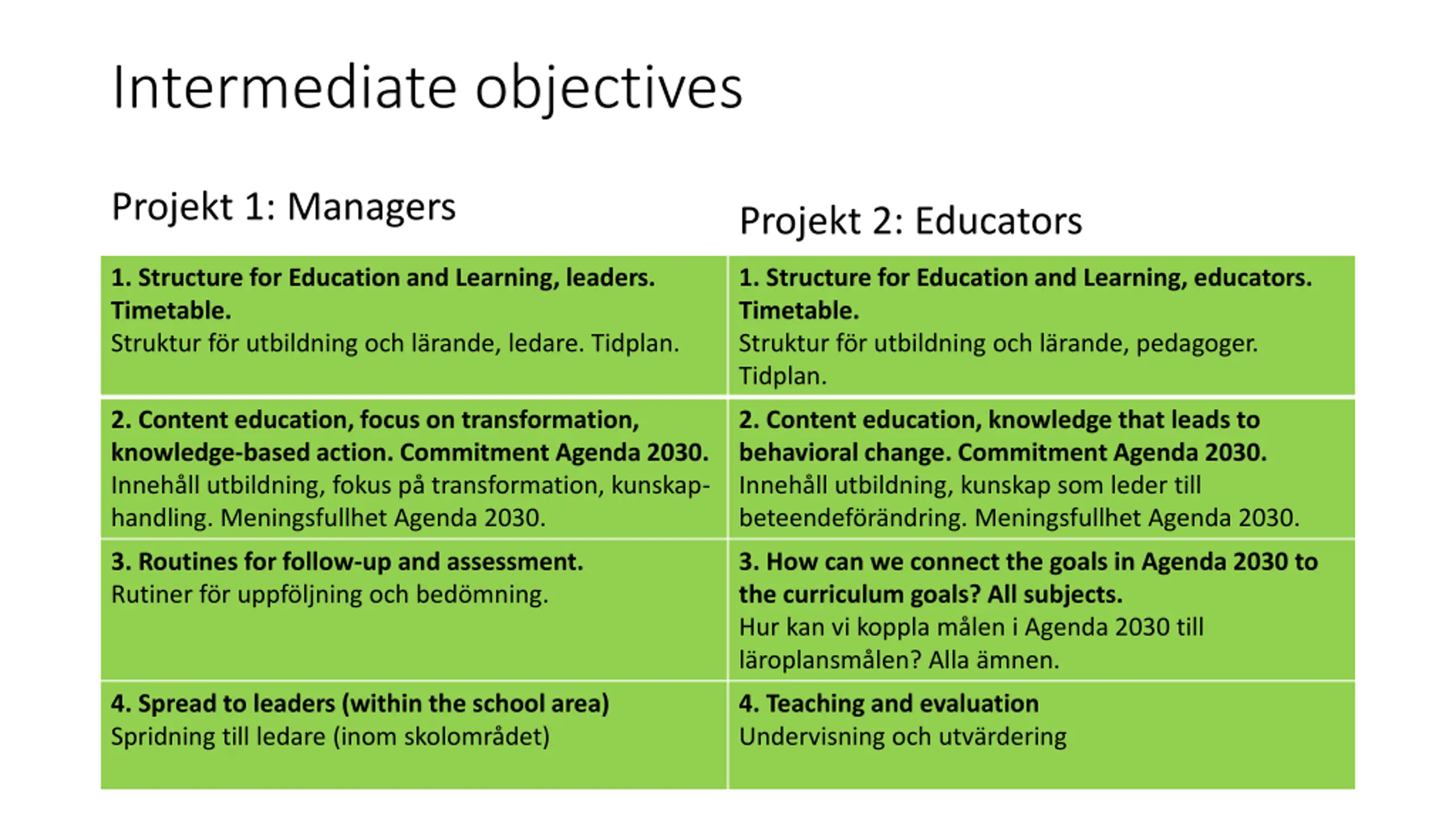 Intermediate objectives Projekt 1: Managers Projekt 2: Educators 1. Structure for Education and Learning, leaders. Timetable. Struktur f r utbildning och l rande, ledare. Tidplan. 1. Structure for Education and Learning, educators. Timetable. Struktur f r utbildning och l rande, pedagoger. Tidplan. 2. Content education, focus on transformation, knowledge-based action. Commitment Agenda 2030. Inneh ll utbildning, fokus p transformation, kunskap- handling. Meningsfullhet Agenda 2030. 2. Content education, knowledge that leads to behavioral change. Commitment Agenda 2030. Inneh ll utbildning, kunskap som leder till beteendef r ndring. Meningsfullhet Agenda 2030. 3. Routines for follow-up and assessment. Rutiner f r uppf ljning och bed mning. 3. How can we connect the goals in Agenda 2030 to the curriculum goals? All subjects. Hur kan vi koppla m len i Agenda 2030 till l roplansm len? Alla mnen. 4. Spread to leaders (within the school area) Spridning till ledare (inom skolomr det) 4. Teaching and evaluation Undervisning och utv rdering