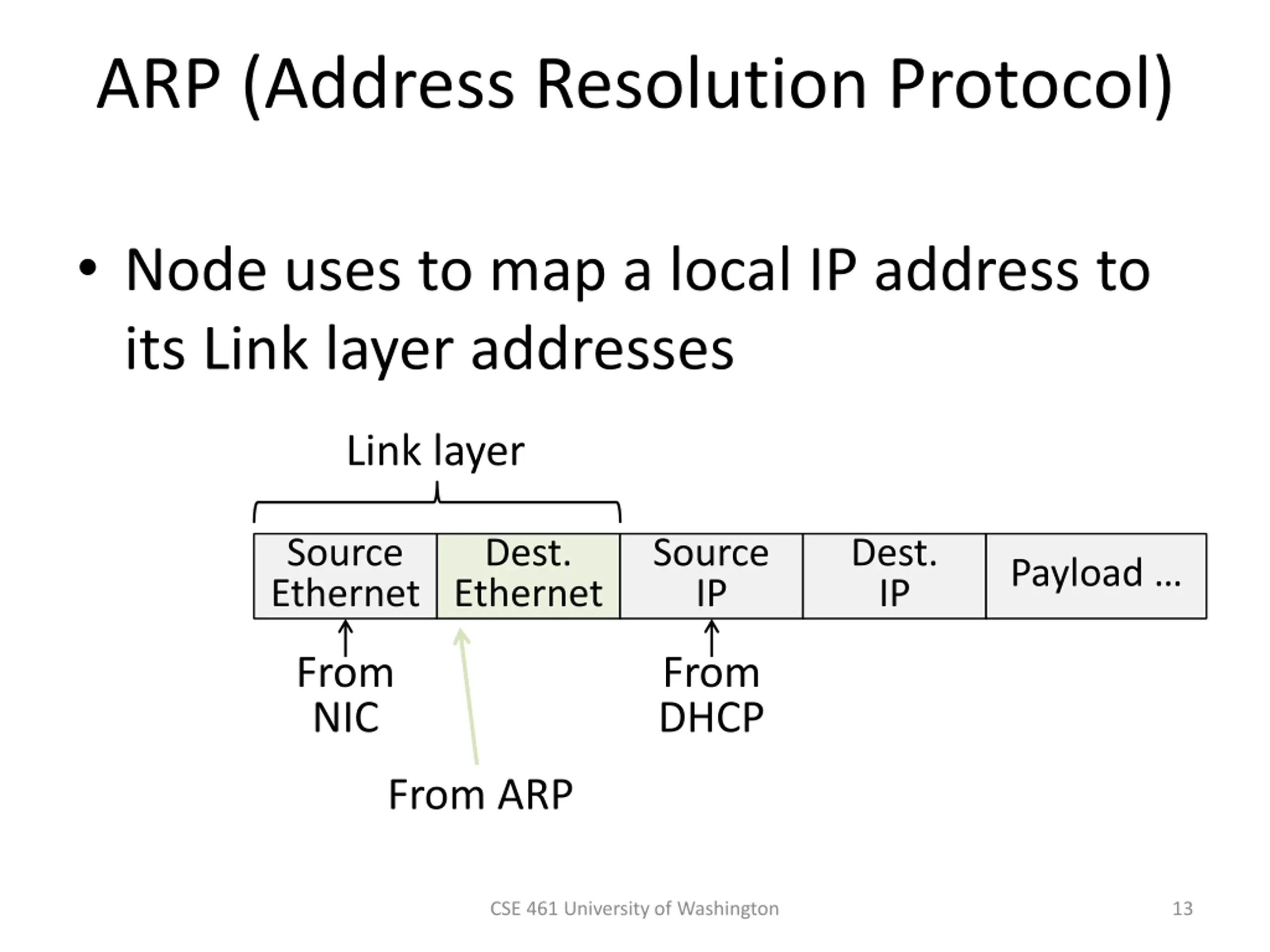 ARP (Address Resolution Protocol) Node uses to map a local IP address to its Link layer addresses Link layer Source Ethernet Dest. Ethernet Source IP Dest. IP Payload From NIC From DHCP From ARP CSE 461 University of Washington 13