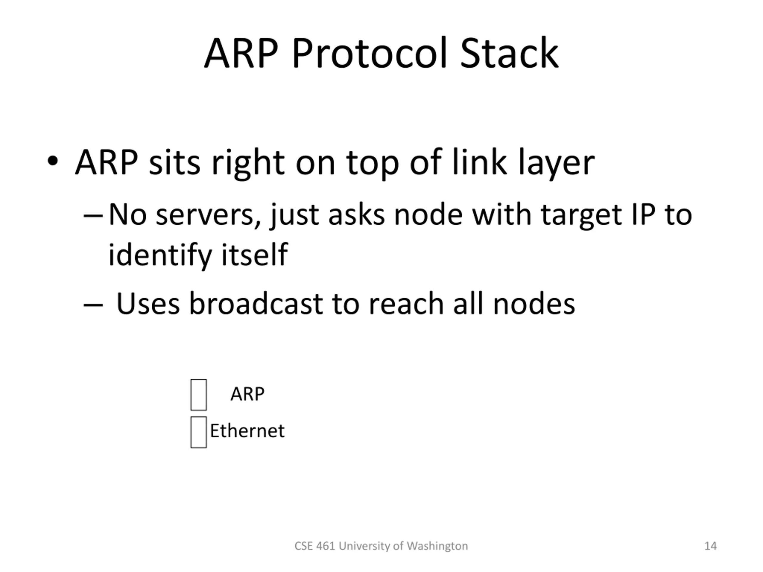 ARP Protocol Stack ARP sits right on top of link layer No servers, just asks node with target IP to identify itself Uses broadcast to reach all nodes ARP Ethernet CSE 461 University of Washington 14