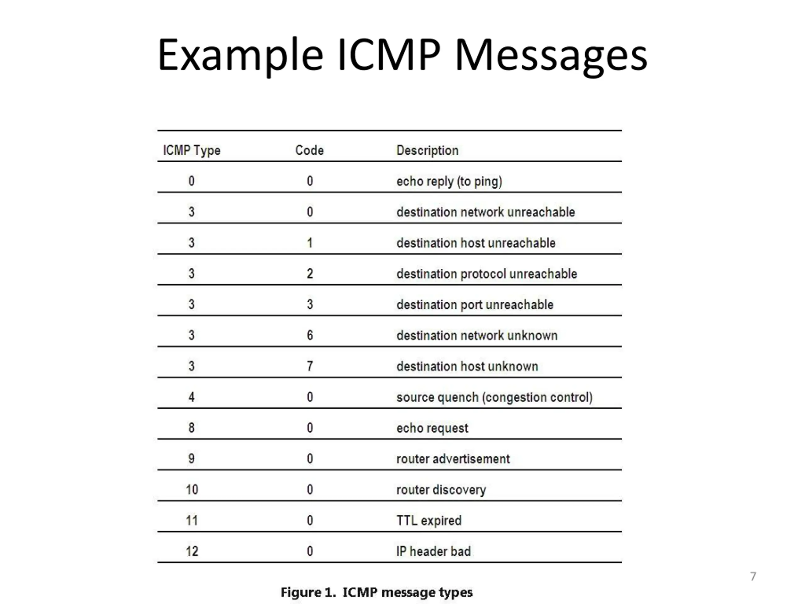 ICMP Message Format (2) Each ICMP message has a Type, Code, and Checksum Often carry the start of the offending packet as payload Each message is carried in an IP packet Portion of offending packet, starting with its IP header Src=router, Dst=A Protocol = 1 Src=A, Dst=B XXXXXXXXXXXXX Type=X, Code=Y ICMP header ICMP data IP header CSE 461 University of Washington 6