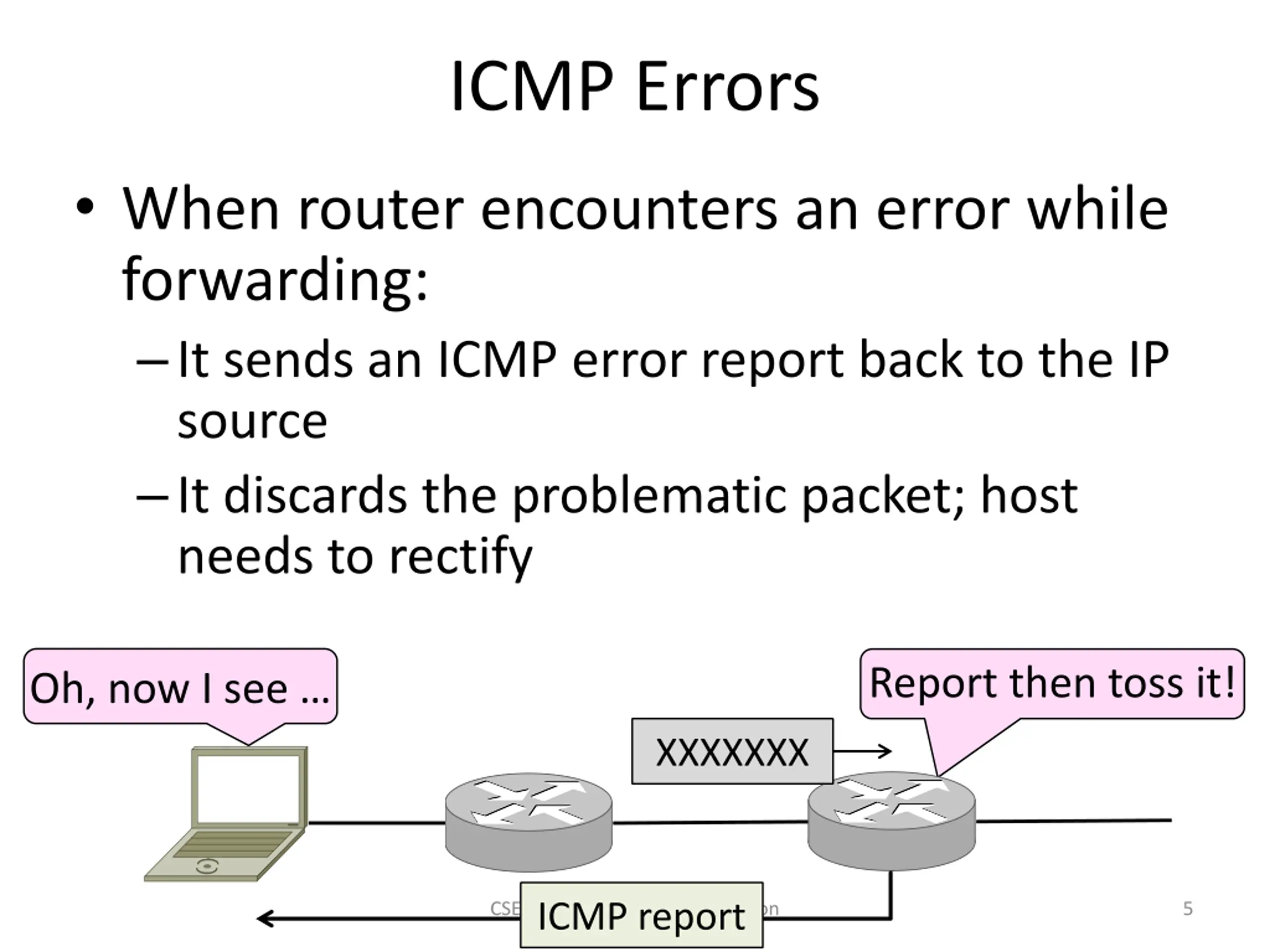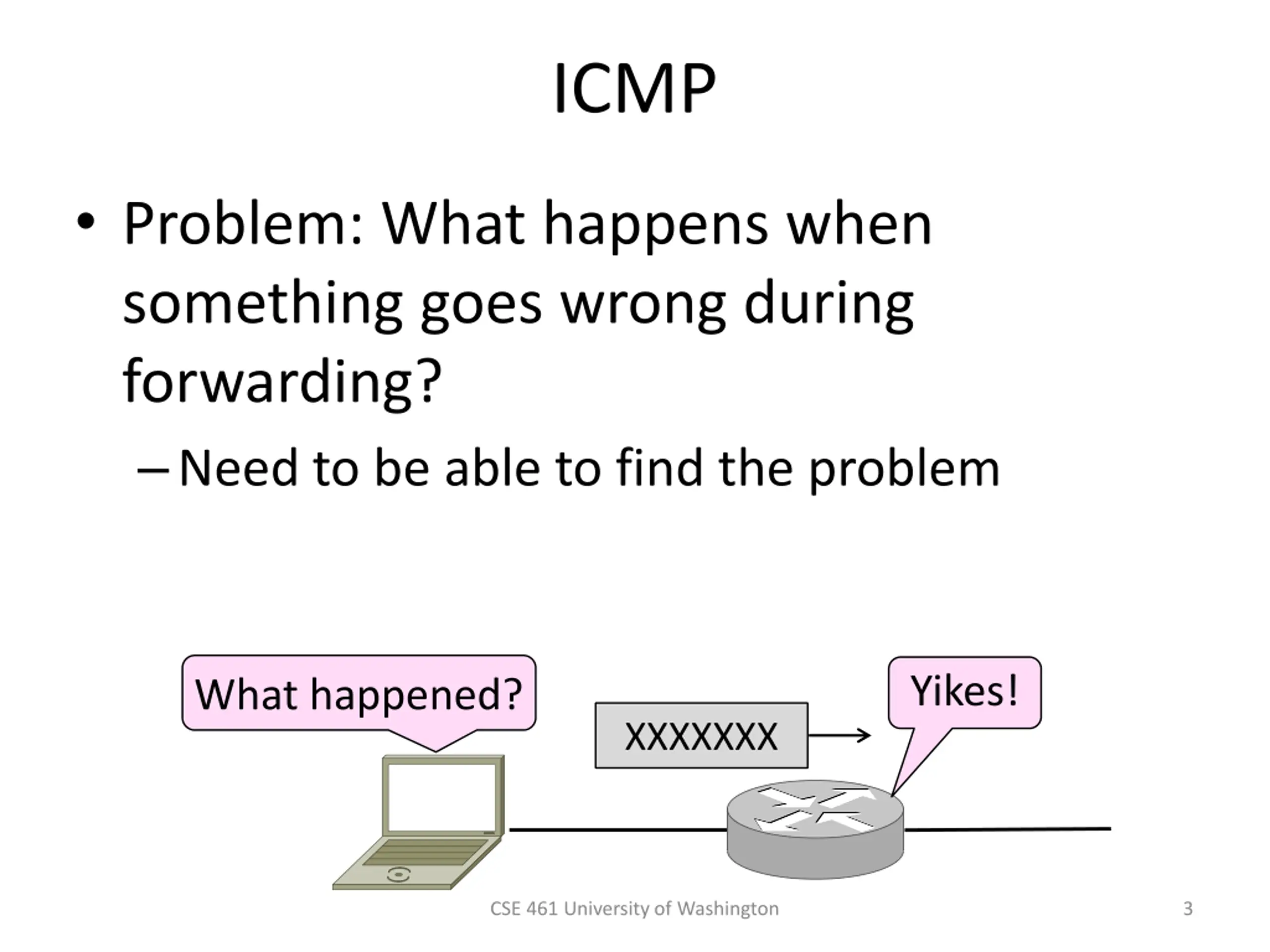 ICMP Problem: What happens when something goes wrong during forwarding? Need to be able to find the problem Yikes! What happened? XXXXXXX CSE 461 University of Washington 3