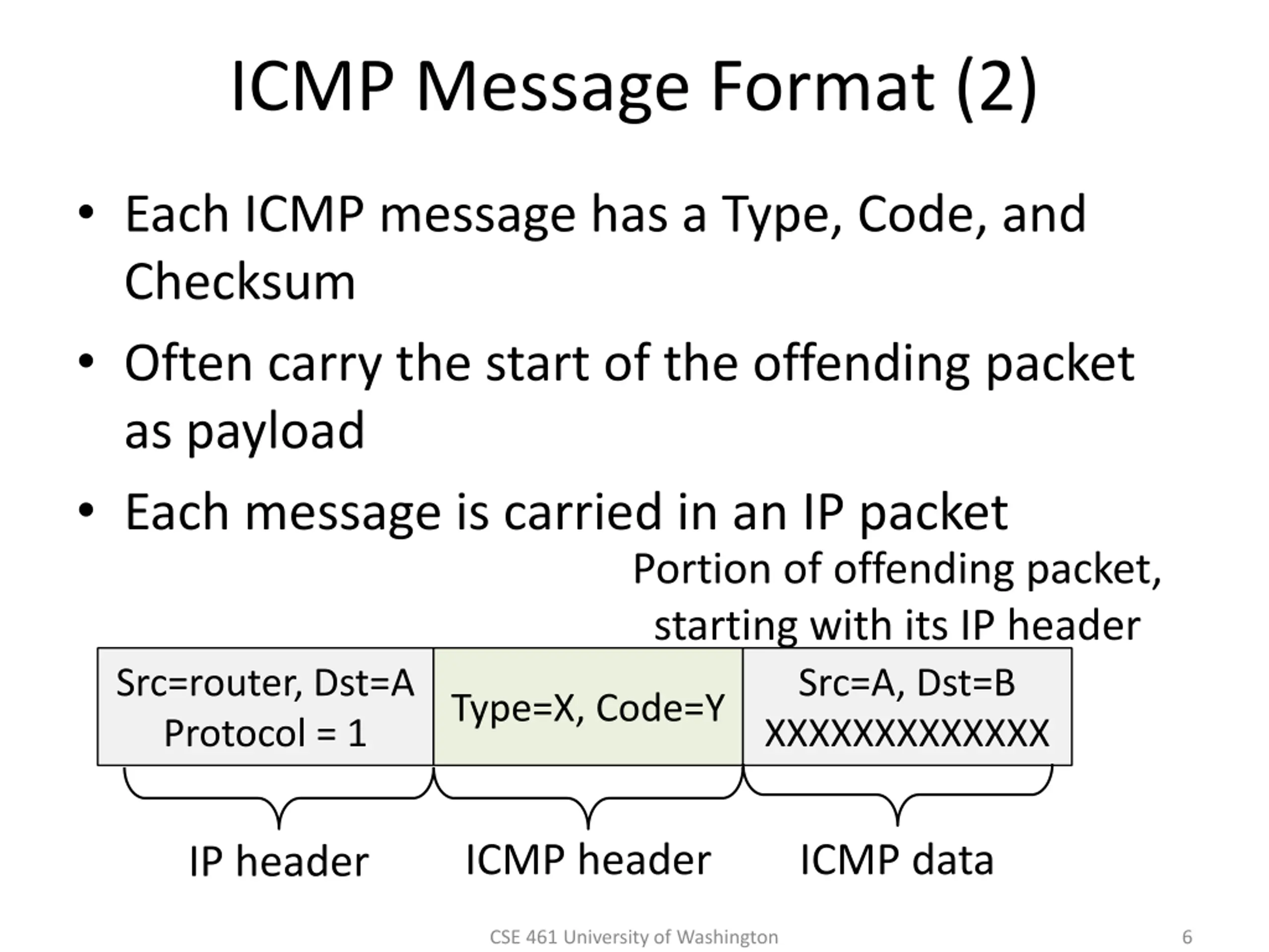 ICMP Errors When router encounters an error while forwarding: It sends an ICMP error report back to the IP source It discards the problematic packet; host needs to rectify Report then toss it! Oh, now I see XXXXXXX CSE 461 University of Washington ICMP report 5