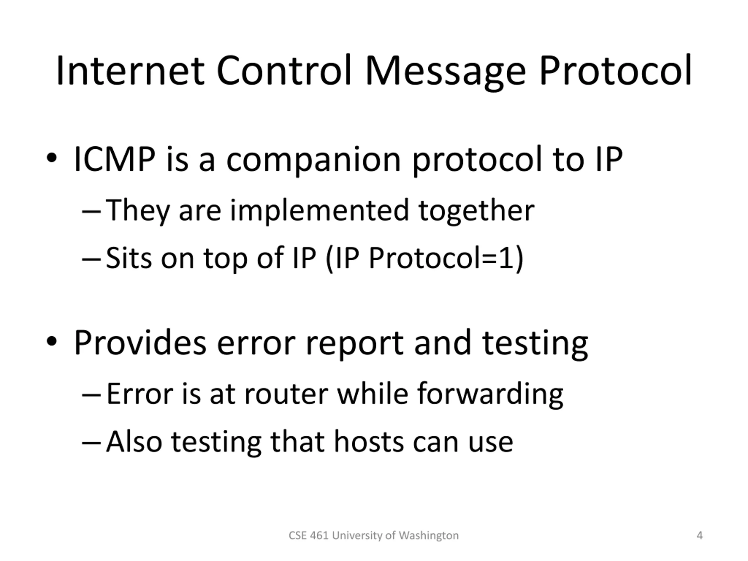 Internet Control Message Protocol ICMP is a companion protocol to IP They are implemented together Sits on top of IP (IP Protocol=1) Provides error report and testing Error is at router while forwarding Also testing that hosts can use CSE 461 University of Washington 4
