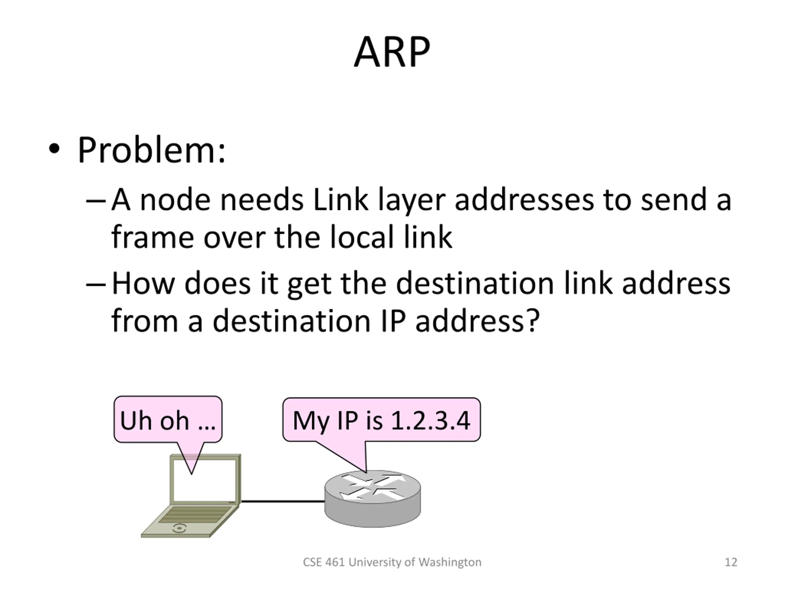 ARP Problem: A node needs Link layer addresses to send a frame over the local link How does it get the destination link address from a destination IP address? My IP is 1.2.3.4 Uh oh CSE 461 University of Washington 12