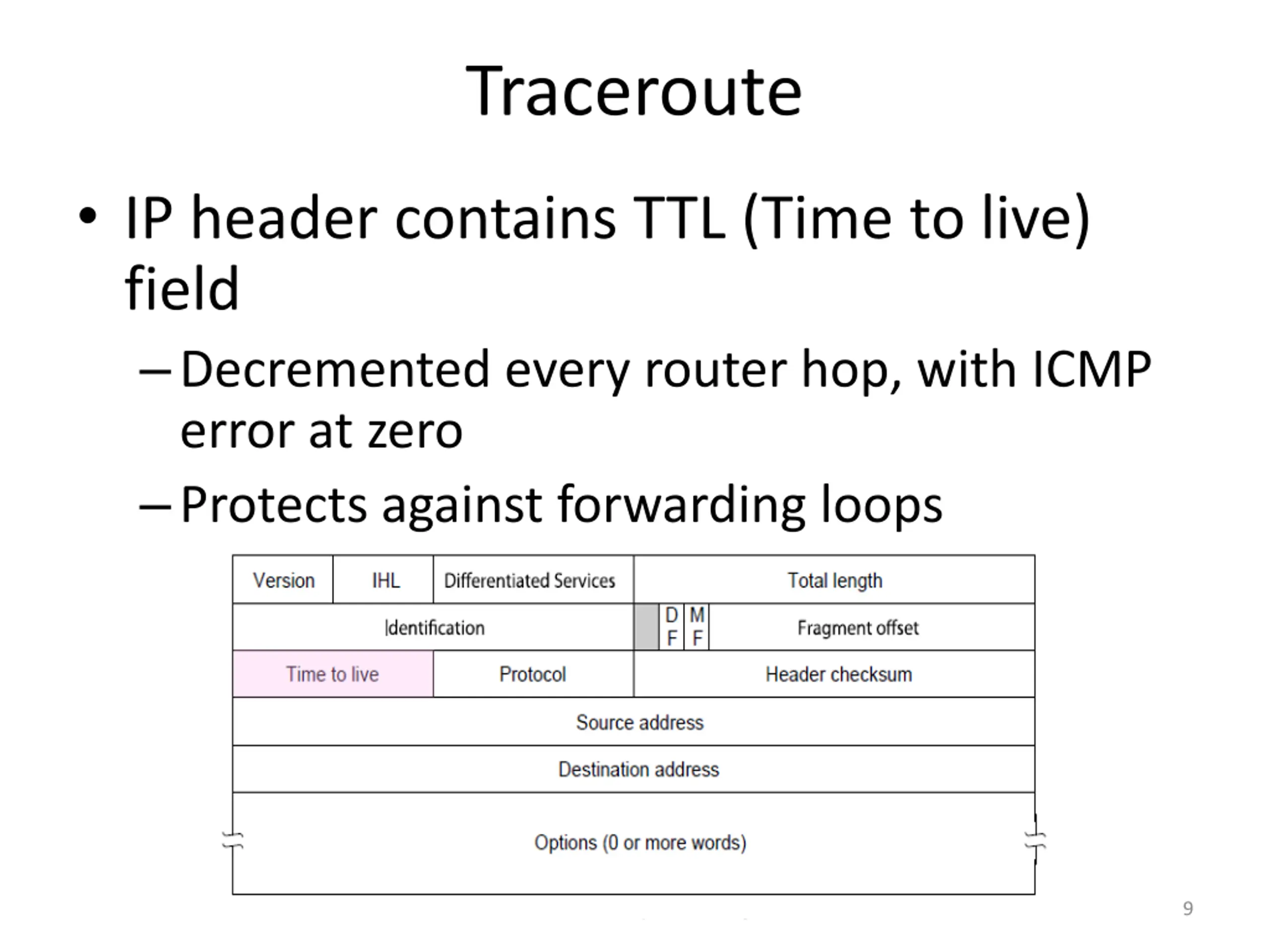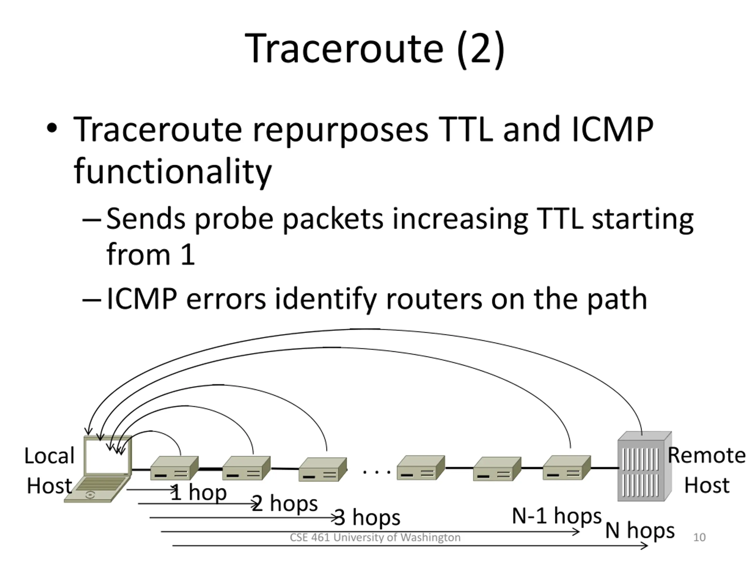 Traceroute IP header contains TTL (Time to live) field Decremented every router hop, with ICMP error at zero Protects against forwarding loops CSE 461 University of Washington 9