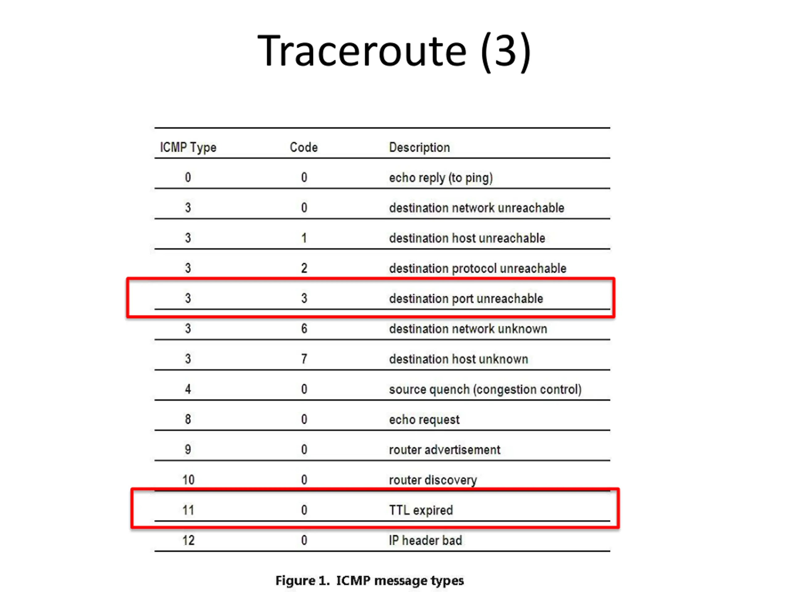 Traceroute (2) Traceroute repurposes TTL and ICMP functionality Sends probe packets increasing TTL starting from 1 ICMP errors identify routers on the path Remote Host Local Host . . . 1 hop 2 hops3 hops N-1 hopsN hops CSE 461 University of Washington 10