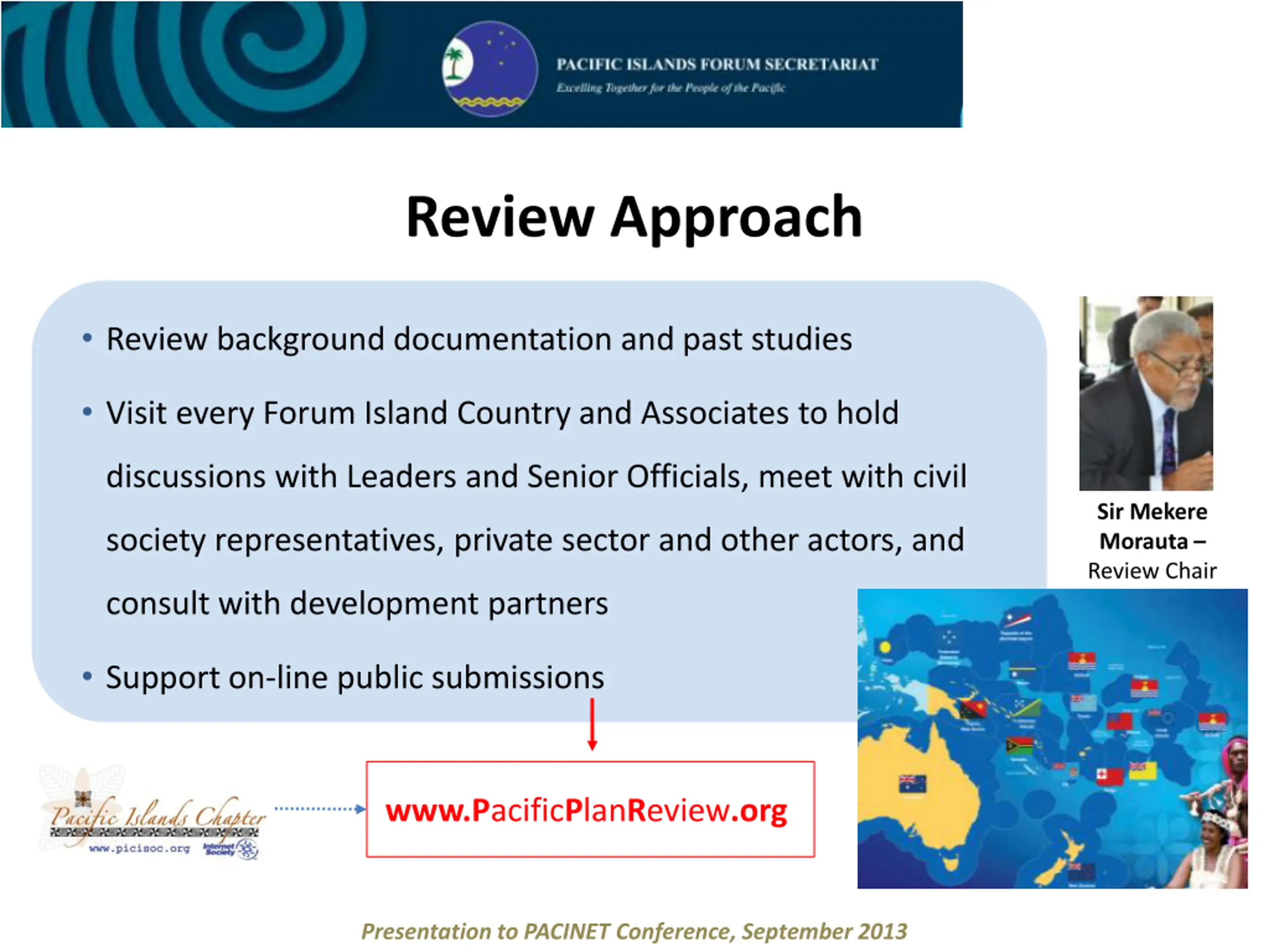 Review Timeframe December 2012 Review Team meets, confirms methodology January May 2013 Country consultations + Public submissions May Regional Consultation workshop and Special Session of Pacific Plan Action Committee in Suva June July Further consultations and report writing August Second Session of Pacific Plan Action Committee in Suva September 2013 Leaders Meeting in the Republic of the Marshall Islands October 2013 Final Review Report to be submitted Communiqu : Leaders ...thanked Sir Mekere Morauta and his Review Team for their extensive consultation and advisory work over the past year and the in-depth analysis that went into their preliminary findings and recommendations. ..[and]...tasked the Forum Officials Committee to review and consider the Final Review Report once finalised and to report to Leaders on proposed next steps for their consideration at the Special Leaders Retreat within six months after receipt of the Final Review Report. Presentation to PACINET Conference, September 2013