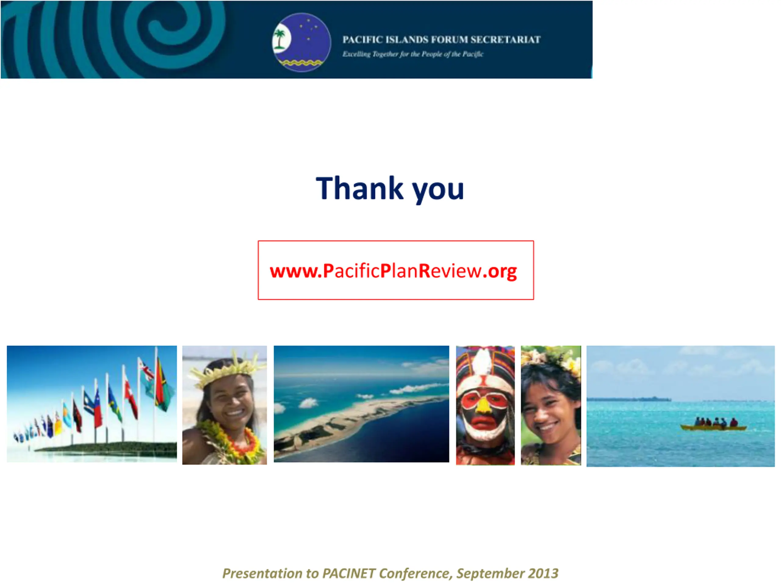 Key Findings from Review Consultations The region is: Diverse and complex; connected but fragmented Faced with vulnerabilities and uncertainties Regionalism is: Needed and desired A long-term project with an as-yet uncertain end-point Supported or complemented by sub-regionalism Greater regional integration: Requires a stronger Pacific plan / framework Should be based on Leaders vision and values, and supported by a process that reflects the true drivers of progress Presentation to PACINET Conference, September 2013