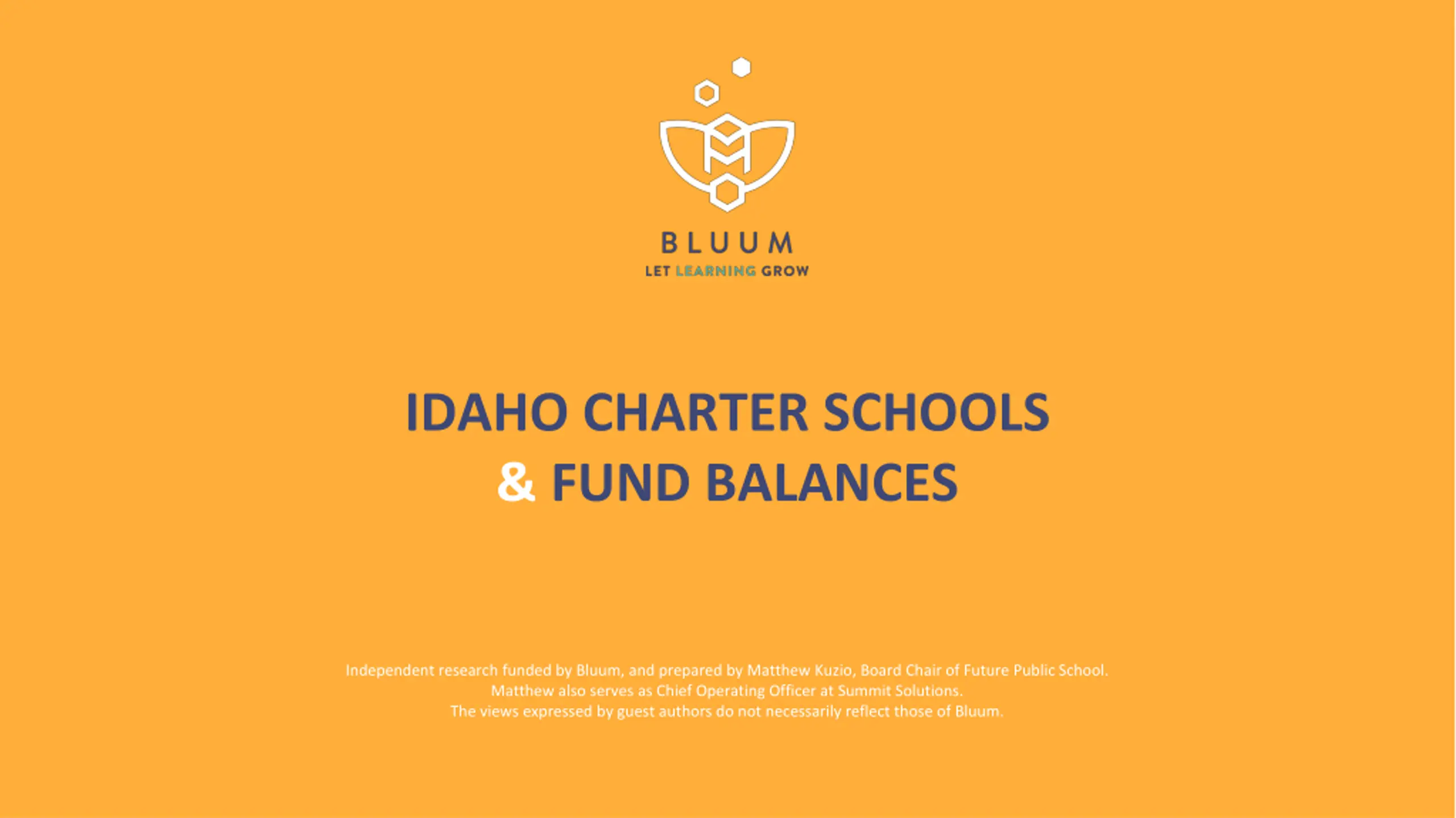 IDAHO CHARTER SCHOOLS & FUND BALANCES Independent research funded by Bluum, and prepared by Matthew Kuzio, Board Chair of Future Public School. Matthew also serves as Chief Operating Officer at Summit Solutions. The views expressed by guest authors do not necessarily reflect those of Bluum.