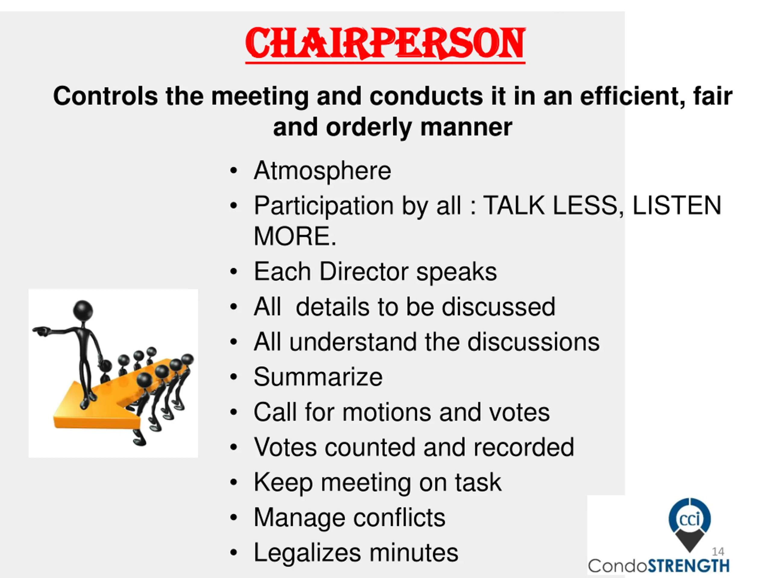 c chairperson hairperson Controls the meeting and conducts it in an efficient, fair and orderly manner Atmosphere Participation by all : TALK LESS, LISTEN MORE. Each Director speaks All details to be discussed All understand the discussions Summarize Call for motions and votes Votes counted and recorded Keep meeting on task Manage conflicts Legalizes minutes 14