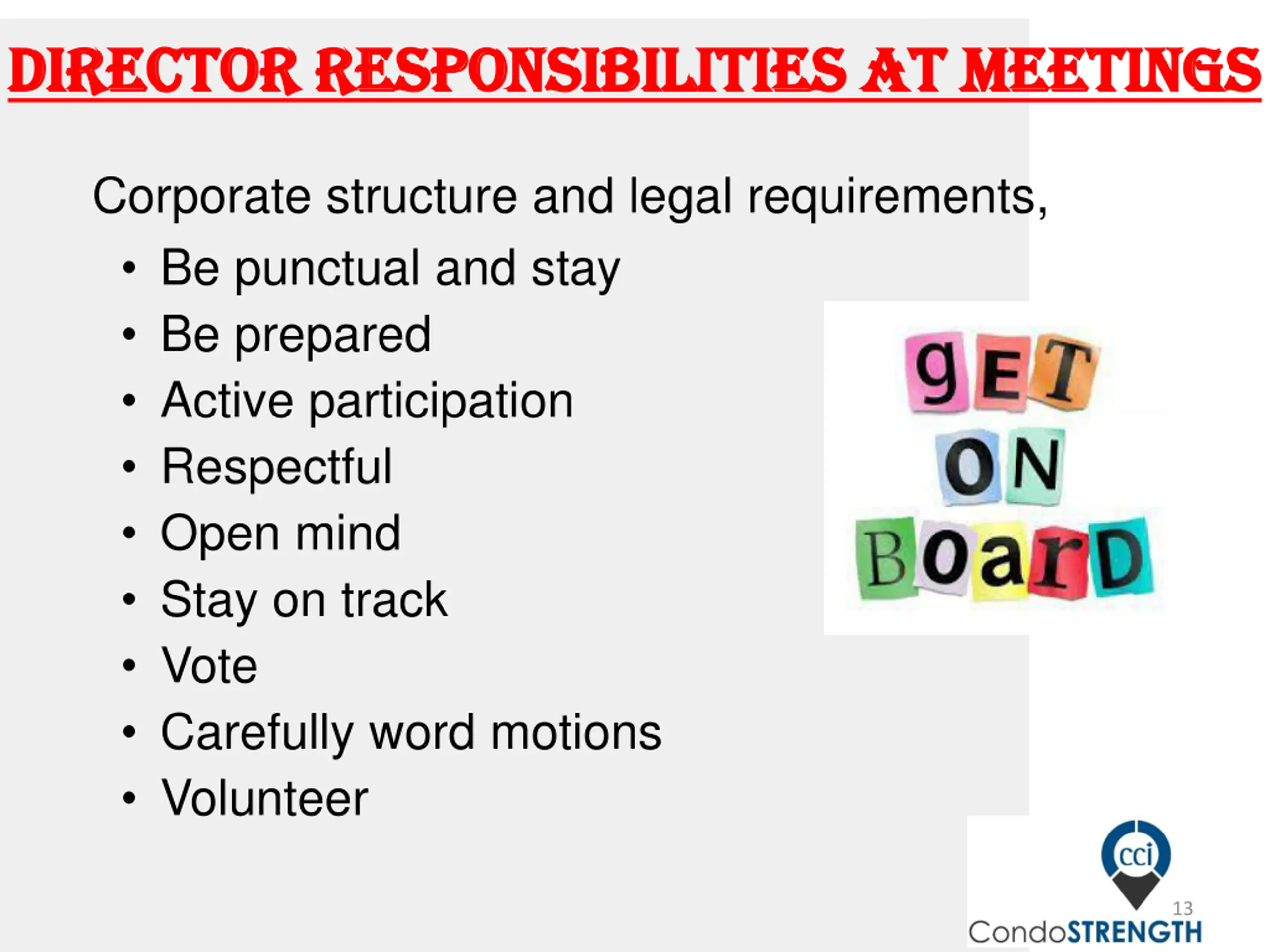 Director responsibilities at meetings Director responsibilities at meetings Corporate structure and legal requirements, Be punctual and stay Be prepared Active participation Respectful Open mind Stay on track Vote Carefully word motions Volunteer 13