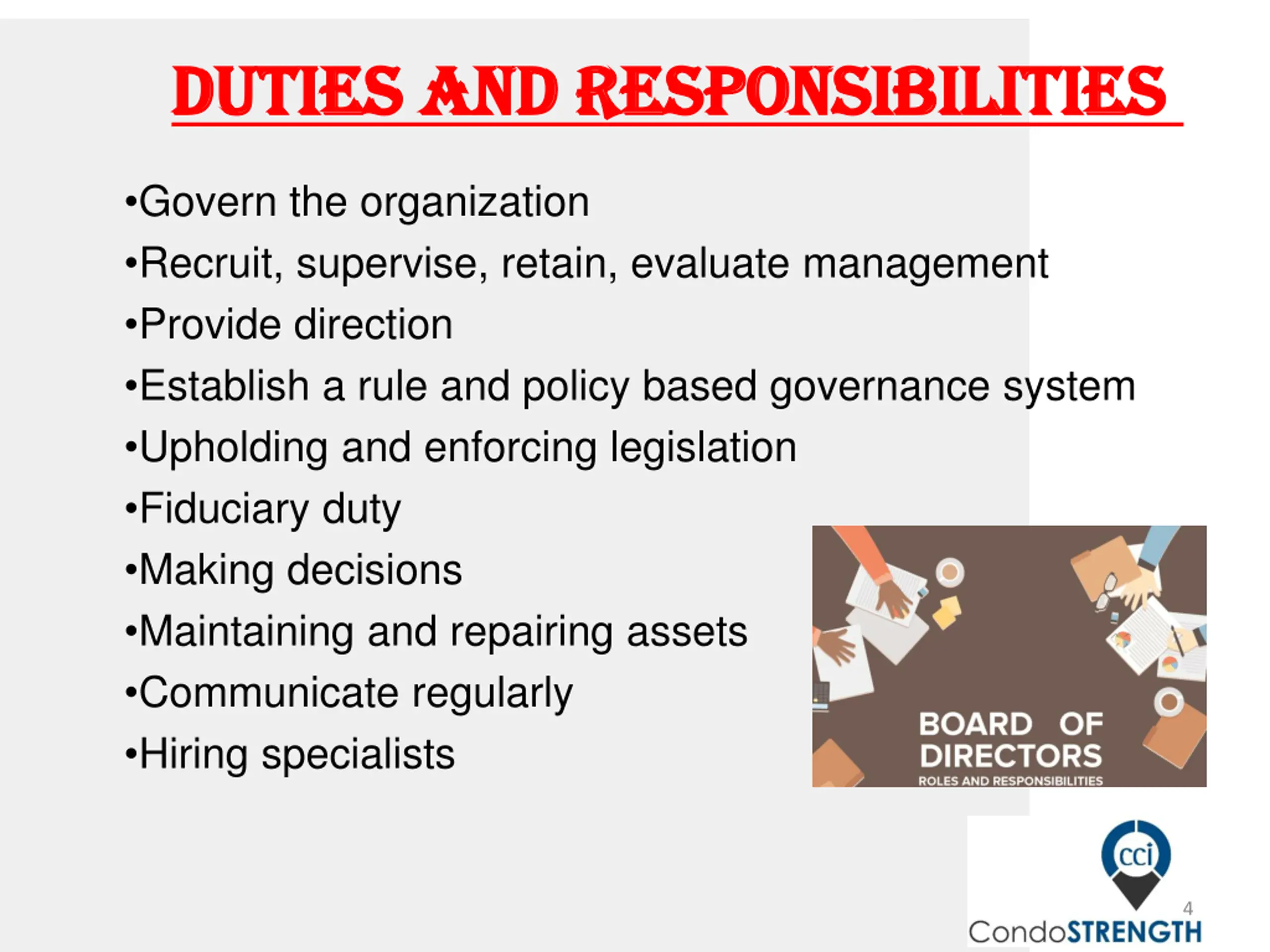 Duties and Responsibilities Duties and Responsibilities Govern the organization Recruit, supervise, retain, evaluate management Provide direction Establish a rule and policy based governance system Upholding and enforcing legislation Fiduciary duty Making decisions Maintaining and repairing assets Communicate regularly Hiring specialists 4